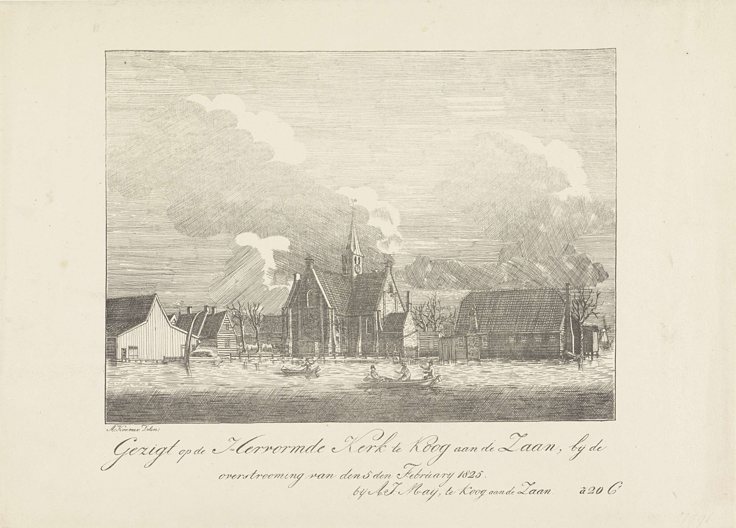 Gezicht op het onder water staande dorp van Koog aan de Zaan tijdens de watersnood op 5 februari 1825. Centraal de Hervormde kerk, op de voorgrond drie personen in een roeibootje. Achter het adres van de uitgever is de prijs 'à 20 Ct' vermeld. Zie ook de pendant.