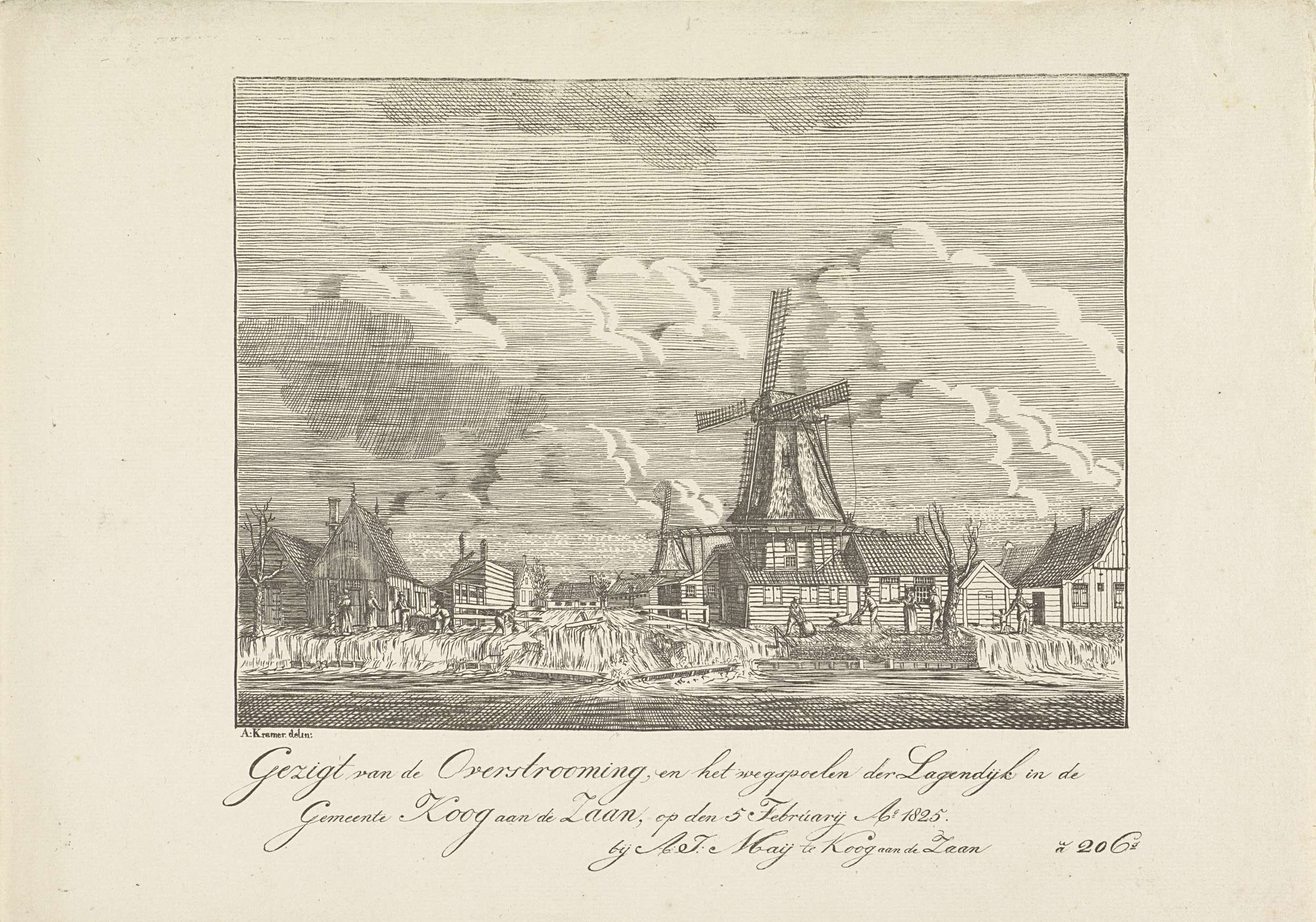 Gezicht op het wegspoelen van de Lagedijk in het dorp van Koog aan de Zaan tijdens de watersnood op 5 februari 1825. Het water stroomt tussen de huizen en de oliemolen De Reus aan het Zuideinde van het dorp door. Achter het adres van de uitgever is de prijs 'à 20 Cs' vermeld. Zie ook ...