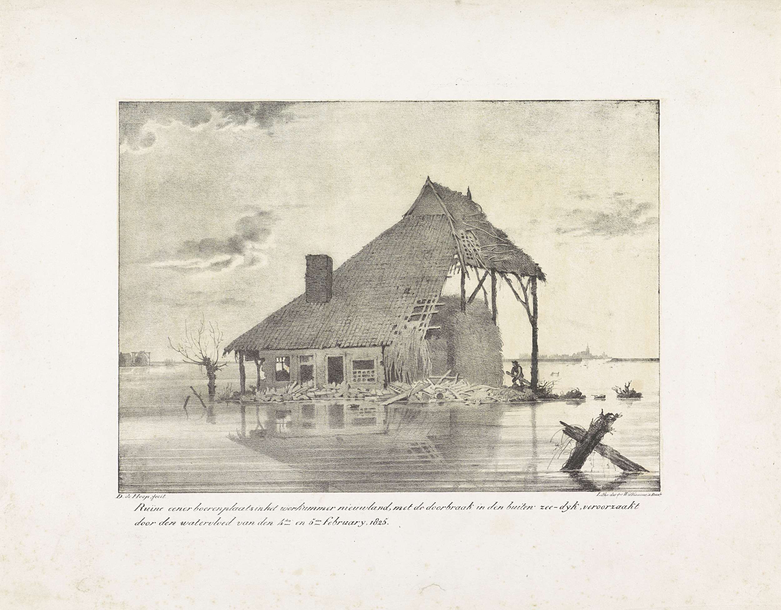 Resten van een grotendeels weggespoelde boerderij in stil water, na doorbraak van de oude zeedijk bij Workum in Friesland tijdens de watersnood op 4-5 februari 1825. Zie ook de pendant.
