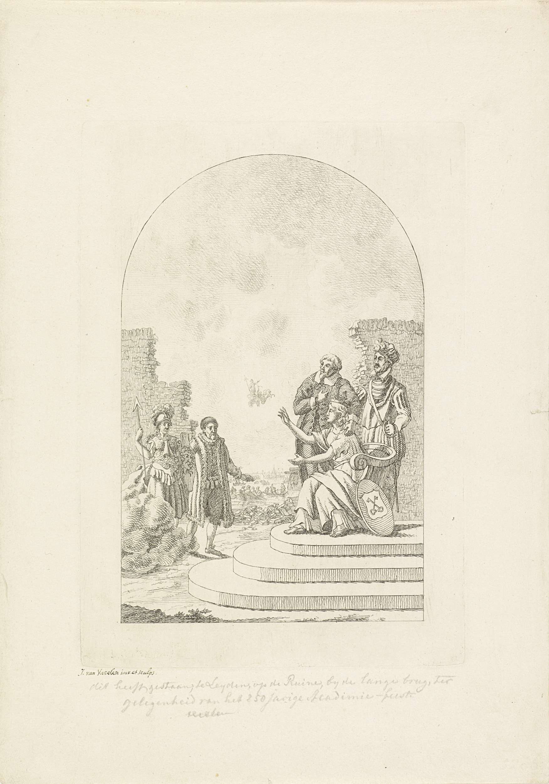 Willem van Oranje en Minerva staande voor de stedenmaagd van Leiden die van haar troon probeert op te staan om de twee te begroeten. Achter haar twee staande mannen: Johan van der Does en burgemeester Pieter van der Werff. Tegen een achtergrond van een doorgebroken bakstenen muur. Door de muur zicht op boten op het ...