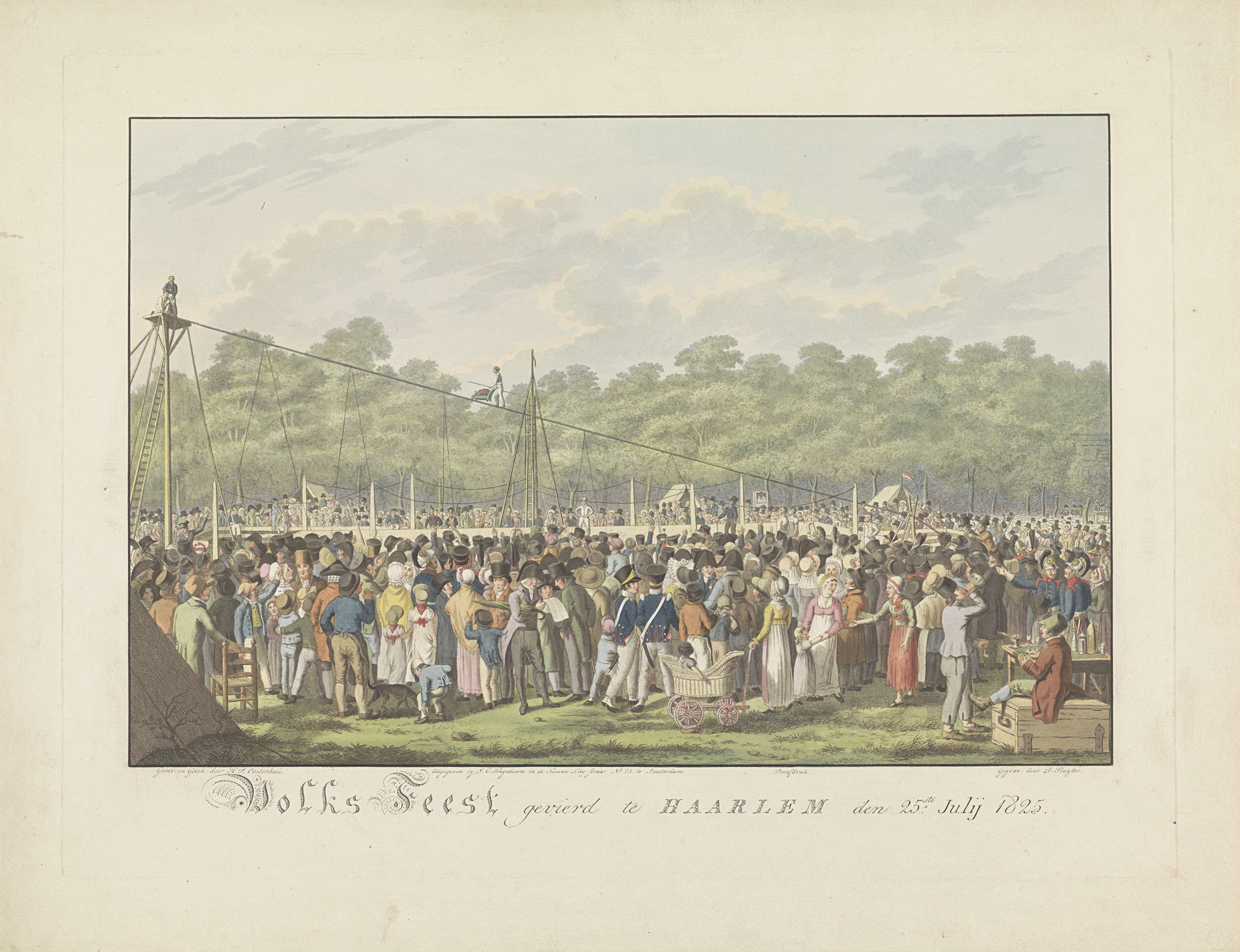 Volksfeest te Haarlem ter gelegenheid van ere van de de Tentoonstelling Nationale Nijverheid op 25 juli 1825. Een grote menigte vermaakt zich onder andere bij een voorstelling of wedstrijd koorddansen. Op de voorgrond de menigte toeschouwers, waartussen een vrouw met een kinderwagen en een bedelares.