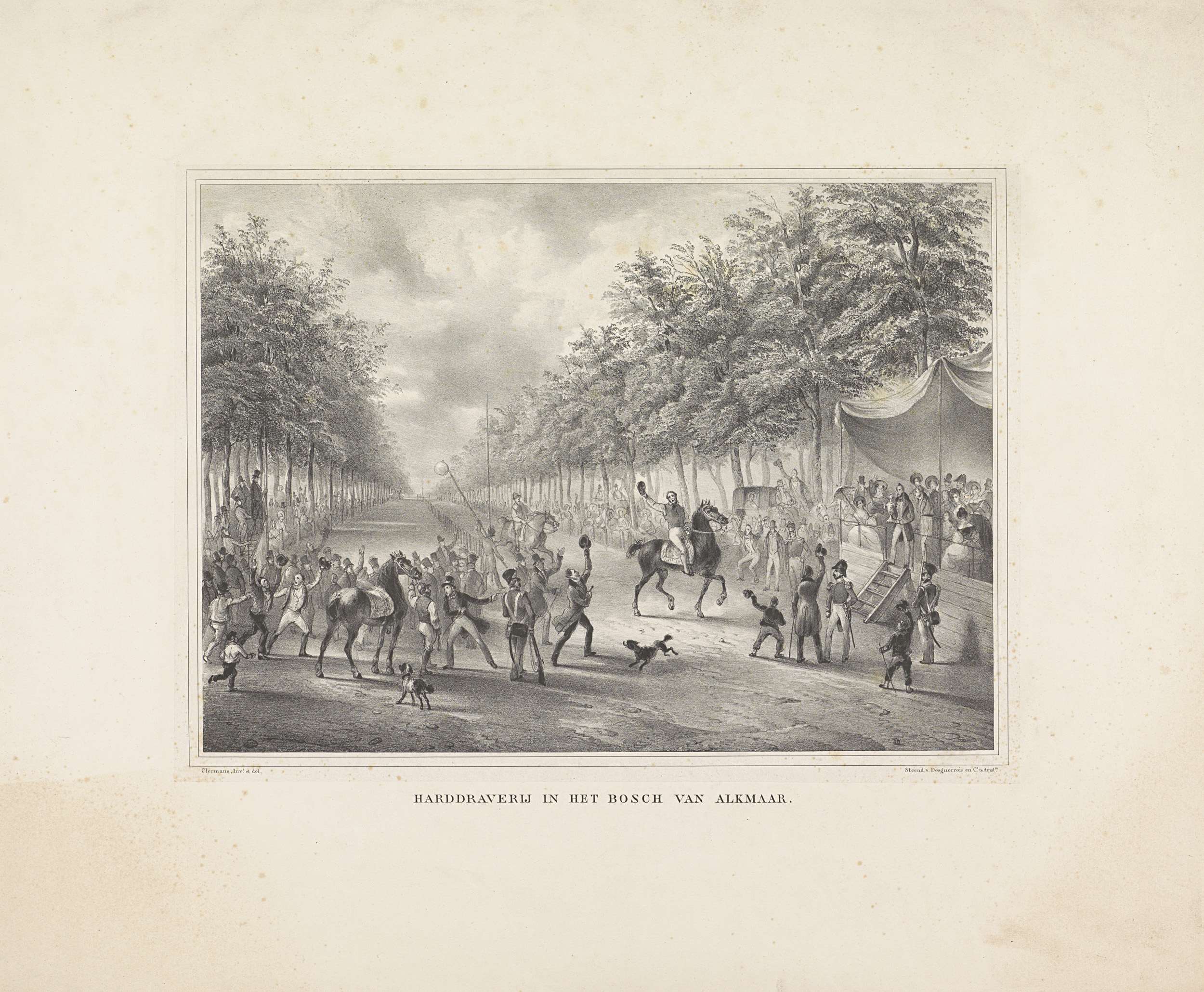 Paardenrace gehouden in de renbaan in de Hout te Alkmaar op 10 september 1825. Langs de baan staan toeschouwers, vooraan zwaait de winnaar van de wedstrijd naar het publiek. Rechts op de tribune staat een man klaar om de beker aan de winnaar uit te reiken,