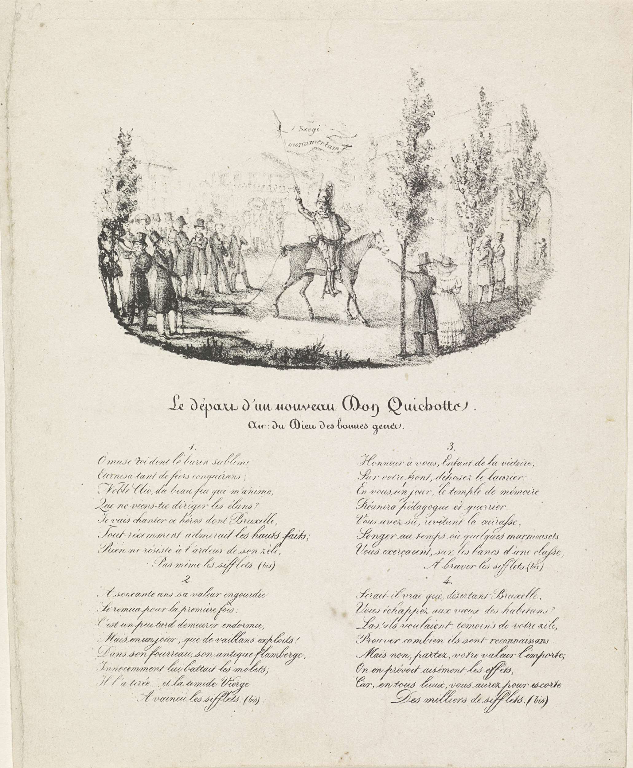 Een geharnaste ridder met vaandel te paard vertrekt en wordt door een menigte uitgeleide gedaan en uitgefloten door schooljongens. Mogelijk het vertrek van de impopulaire plaatselijke commandant generaal Vauthier uit Brussel of van de bejaarde hoogleraar P. Lesbroussart uit Leuven. Met Frans vers in vier coupletten.