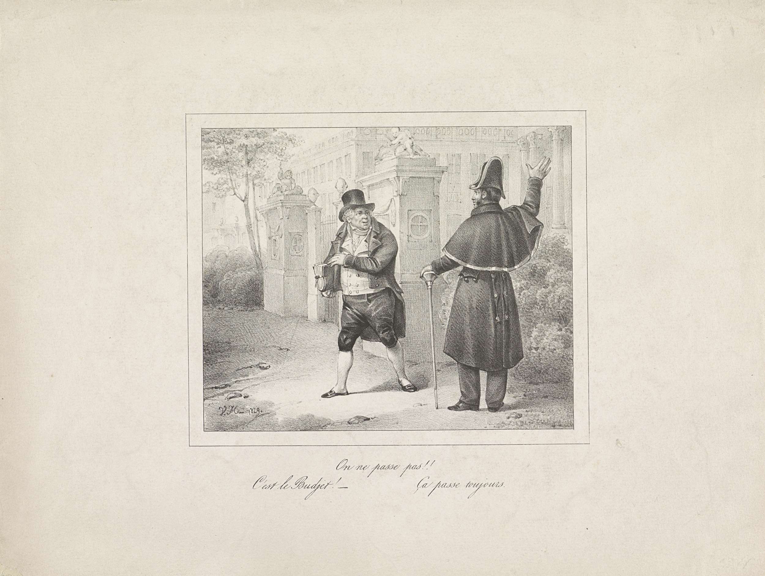 Spotprent op het voortdurend door de Staten-Generaal aannemen van de begroting, december 1826. Bij de ingang van het Paleis der Staten-Generaal in Brussel wil de wacht een man tegenhouden, als die zegt dat het om de begroting gaat laat de wacht hem passeren met de woorden 'Ça passe toujours'.