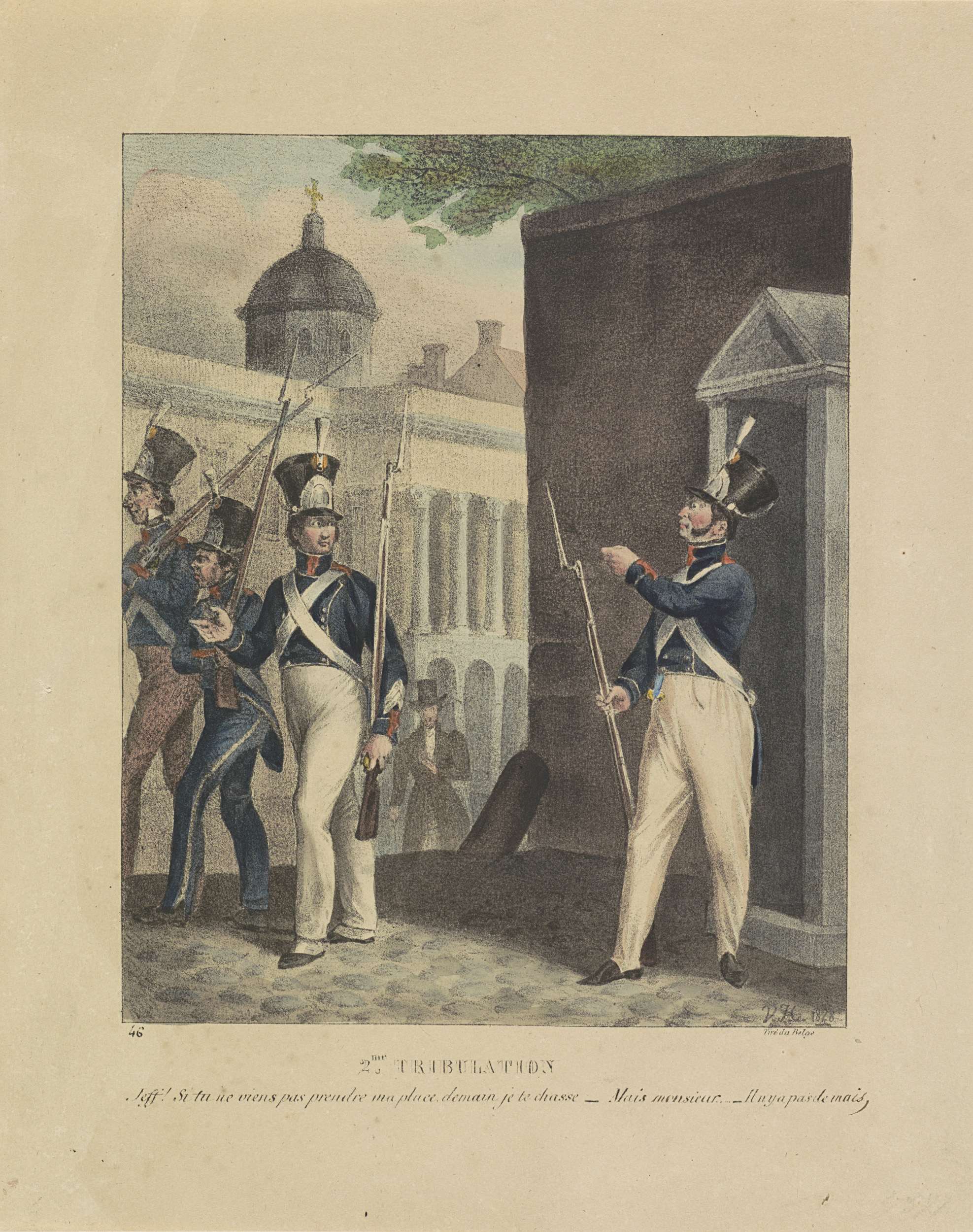 Een heer die op wacht staat dreigt met zijn vuist naar zijn voormalige bediende die nu korporaal is geworden. Linksonder genummerd 46. Onderdeel van een serie van ca. 24 spotprenten uit 1828 op de wanverhoudingen binnen de Belgische schutterijen door de maatschappelijke ongelijkheid binnen het korps, na de reorganisatie ingevoerd op 11 april 1827.