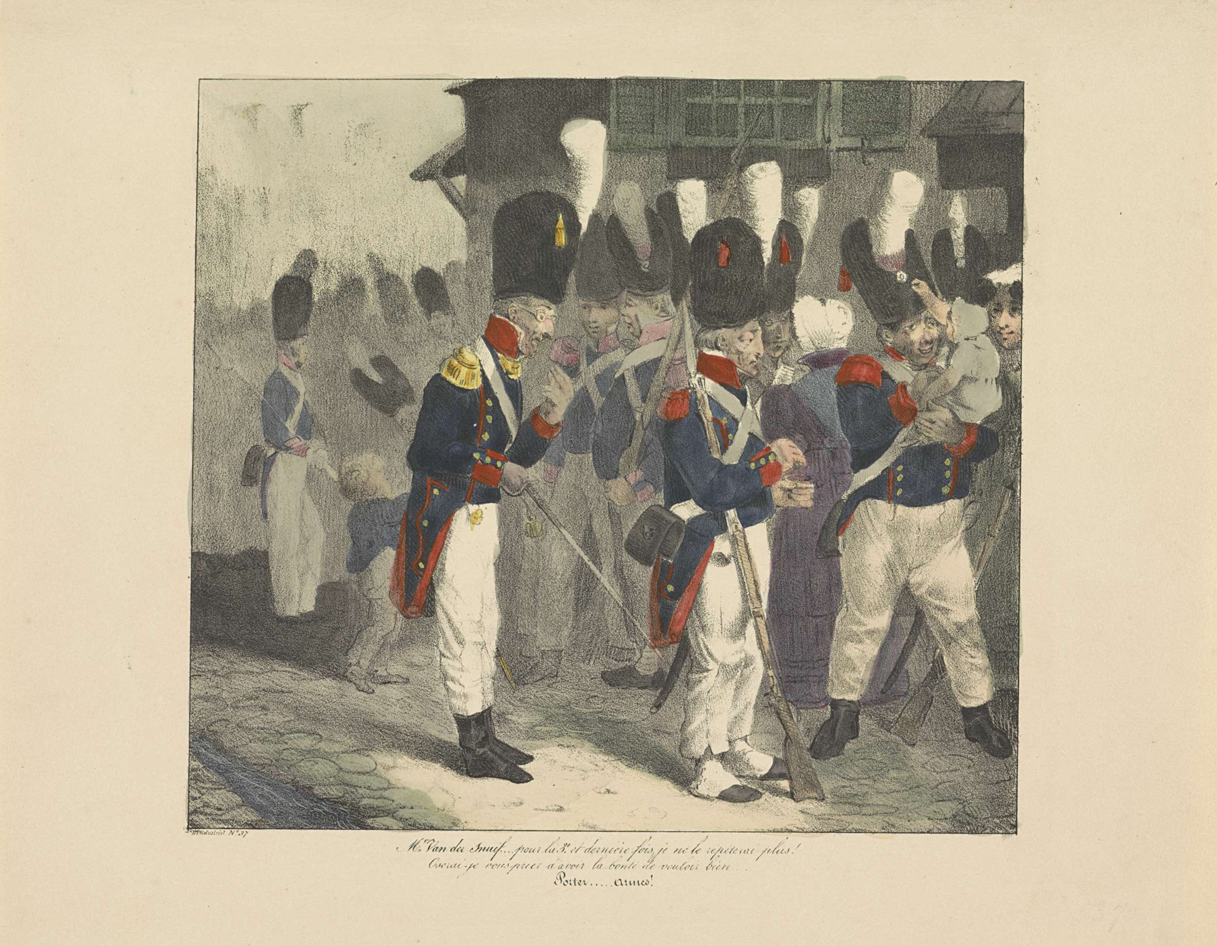 Van der Snuijff heeft een kind op de arm ipv zijn geweer. Onderdeel van een serie van ca. 24 spotprenten uit 1828 op de wanverhoudingen binnen de Belgische schutterijen door de maatschappelijke ongelijkheid binnen het korps, na de reorganisatie ingevoerd op 11 april 1827.