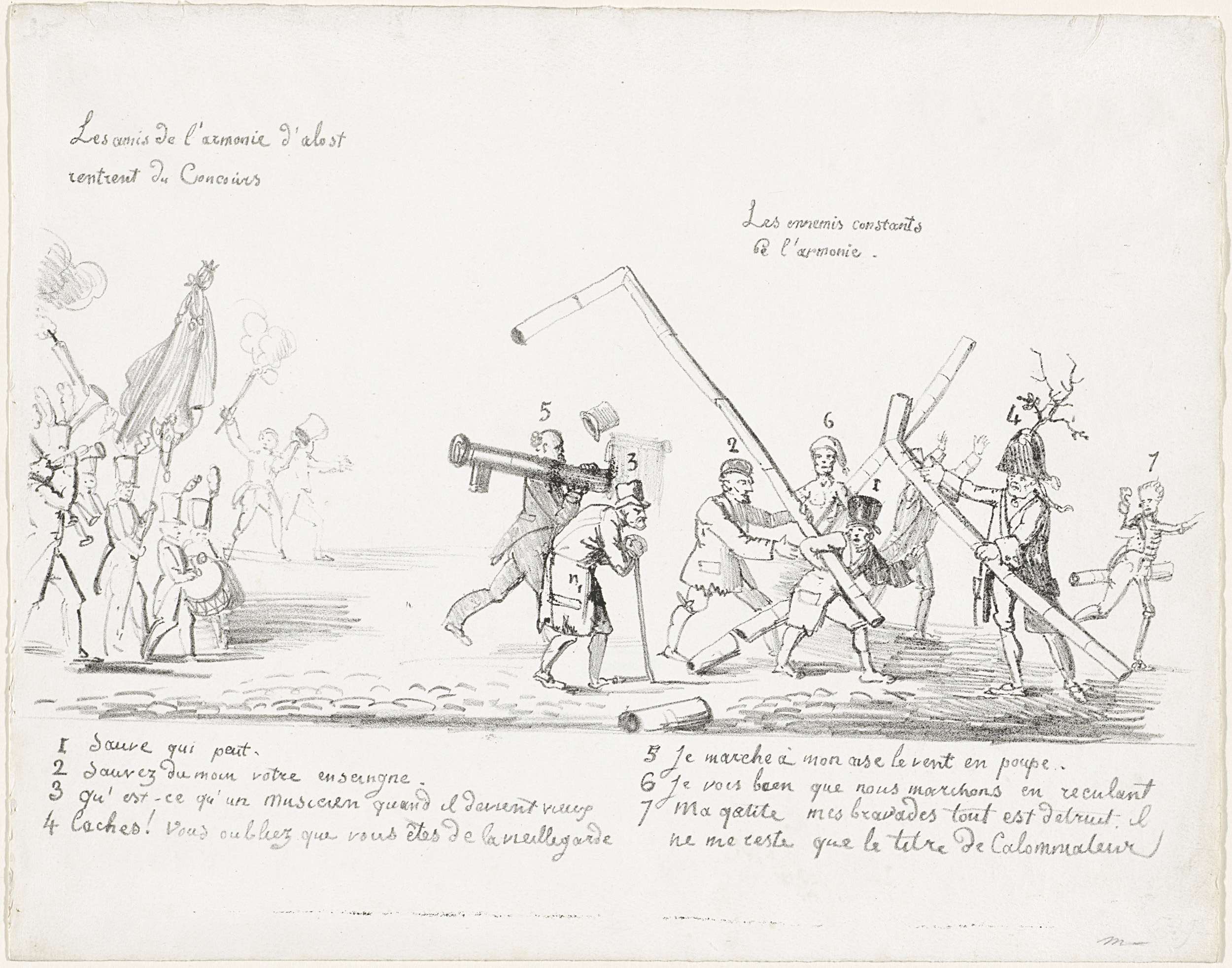 De aftocht van een onsuccesvolle muziekkorps met kachelpijpen, links nadert een succesvolle muziekkorps uit Aalst (Alost). Onder de voorstelling de legenda 1-7 in het Frans. Spotprent op het muzikale concours te Brussel, 17 juli 1827. Zie ook de pendant.