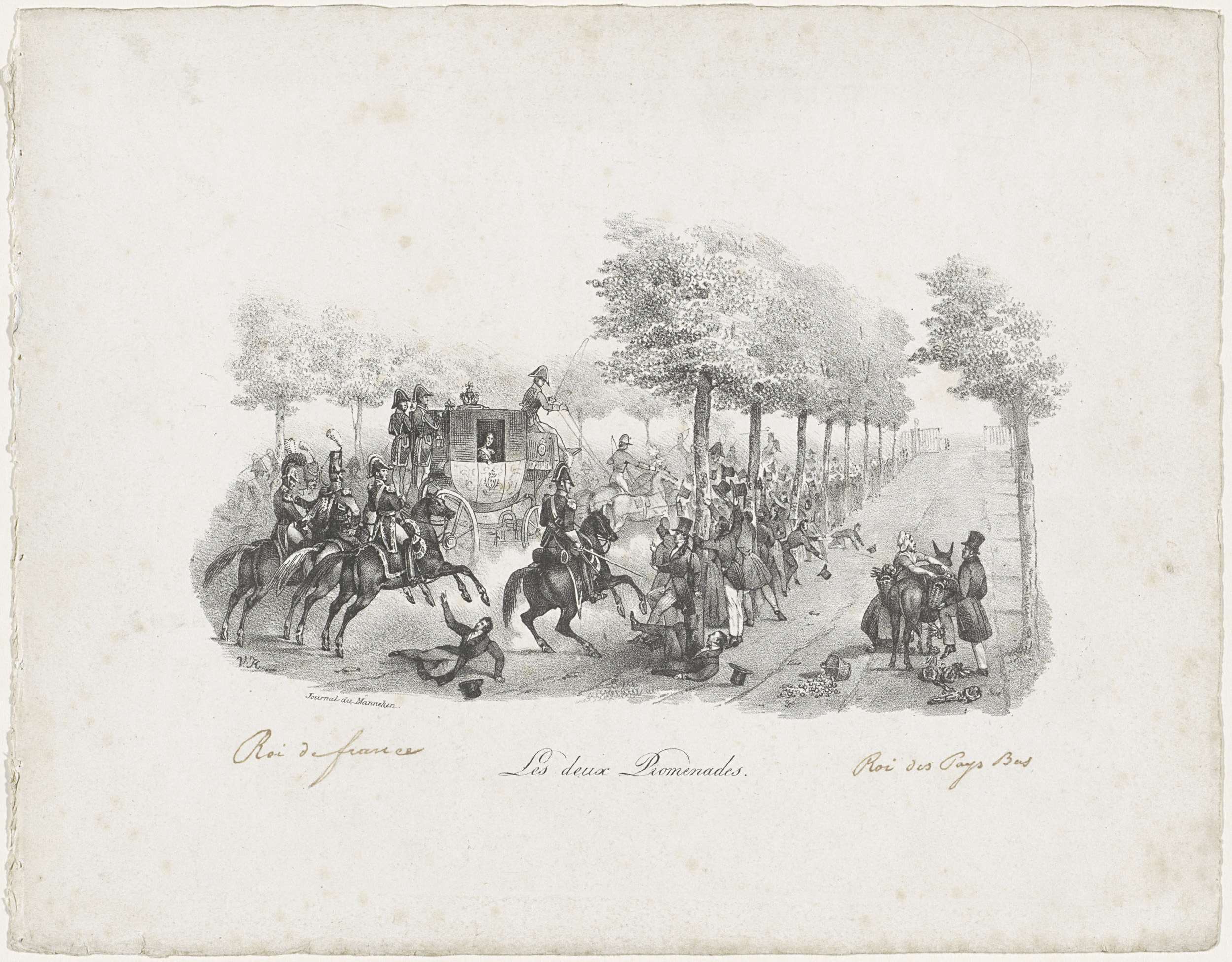 Het verschil in stijl van een wandelrit bij koning Karel X van Frankrijk en bij koning Willem I. De franse koning gaat in een koets begeleid door officieren van de garde, de Nederlandse koning daarentegen gaat alleen wandelen en helpt onderweg een vrouw met haar gevallen bagage.