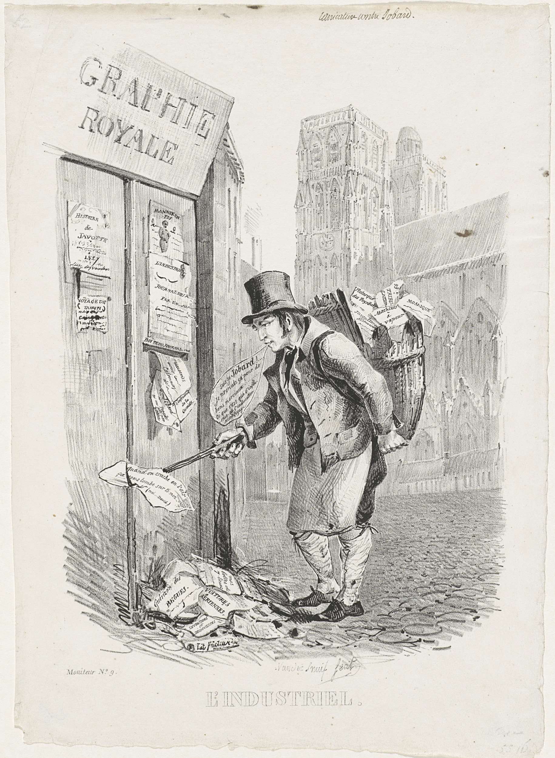 Spotprent op de steendrukker en uitgever van het tijdschrift l'Industriel, Jean Baptiste Ambroise Marcellin Jobard te Brussel, 1827. Jobard voorgesteld als voddenraper met een mand op de rug die op straat en van een muur allerlei stukken papier van zijn eigen uitgaven en uitvindingen raapt. Linksboven is een deel van het uithangbord van de zaak ...