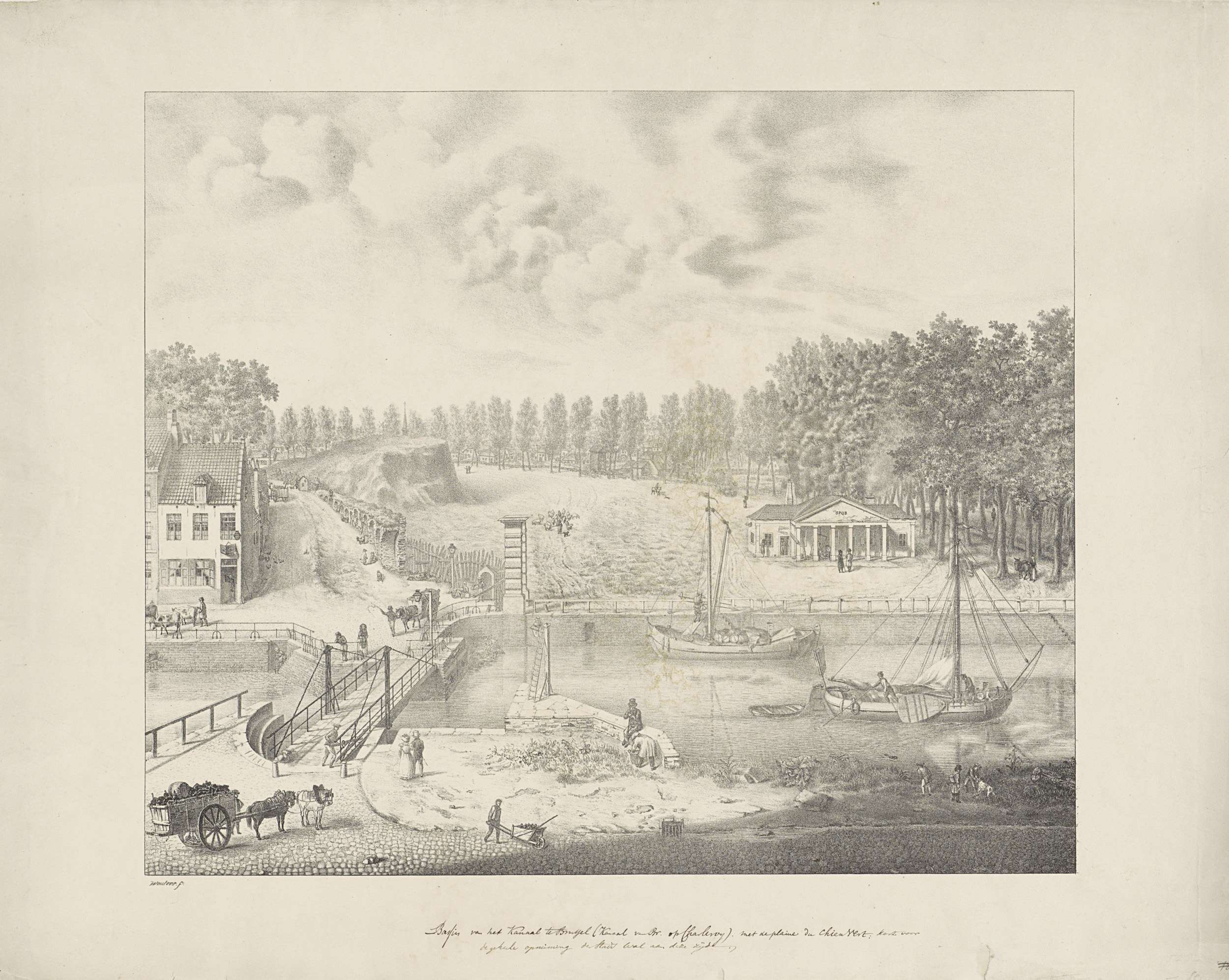 Gezicht op het bassin van het Kanaal van Brussel, links een draaibrug. Het kanaal Charleroi-Brussel werd gebouwd tussen 1827-1832. Aan de overzijde de vlakte du Chien Vert en restanten van de oude stadswal. Rechts een waaggebouw gemerkt SPQB.