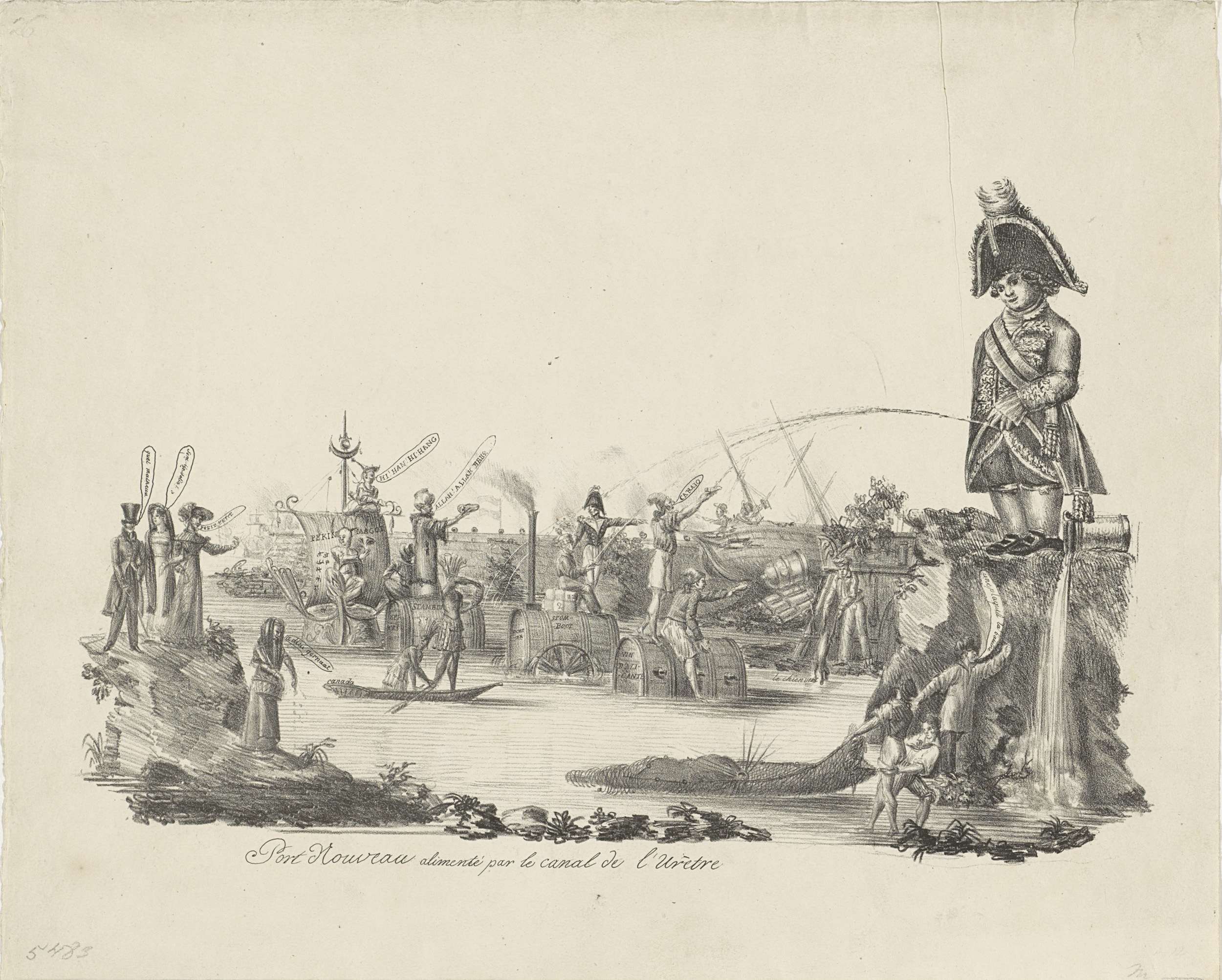 Spotprent op het nieuwe kanaal van Charleroi naar Brussel, gebouwd tussen 1827-1832. Rechts pist Manneken Pis in het kanaal, links varen mensen uit onder andere Canada, Peking, Amerika, Alicante en het Ottomaanse Rijks op vaten en vaartuigen door het kanaal. Met schalen of kommen proberen ze de pis van Manneke Pis op te vangen. Onderschrift ...