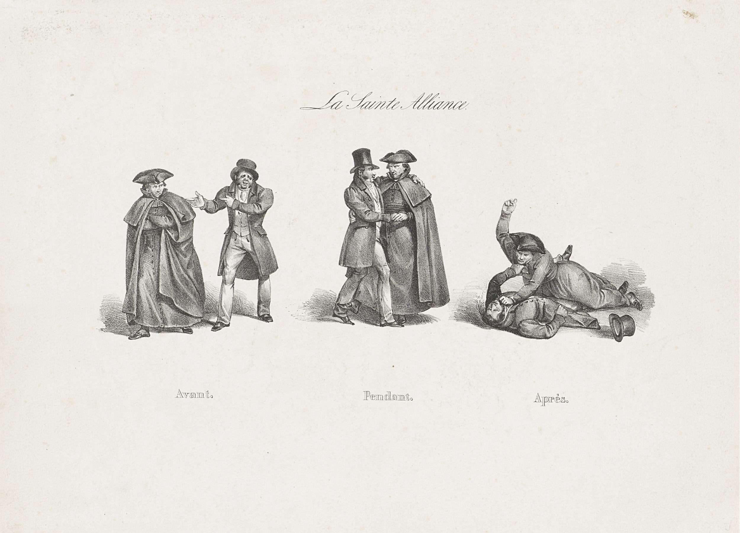 Spotprent op de alliantie gesloten in de Zuidelijke Nederlanden tussen de roomse klerikale partij en de liberale partij tegen de Nederlandse regering, 23 juli 1828. Drie voorstellingen van twee figuren, vertegenwoordigers van de twee partijen. Links 'avant' als vijanden, centraal 'pendant' als vrienden en rechts 'après' rollend vechtend met elkaar over de grond.