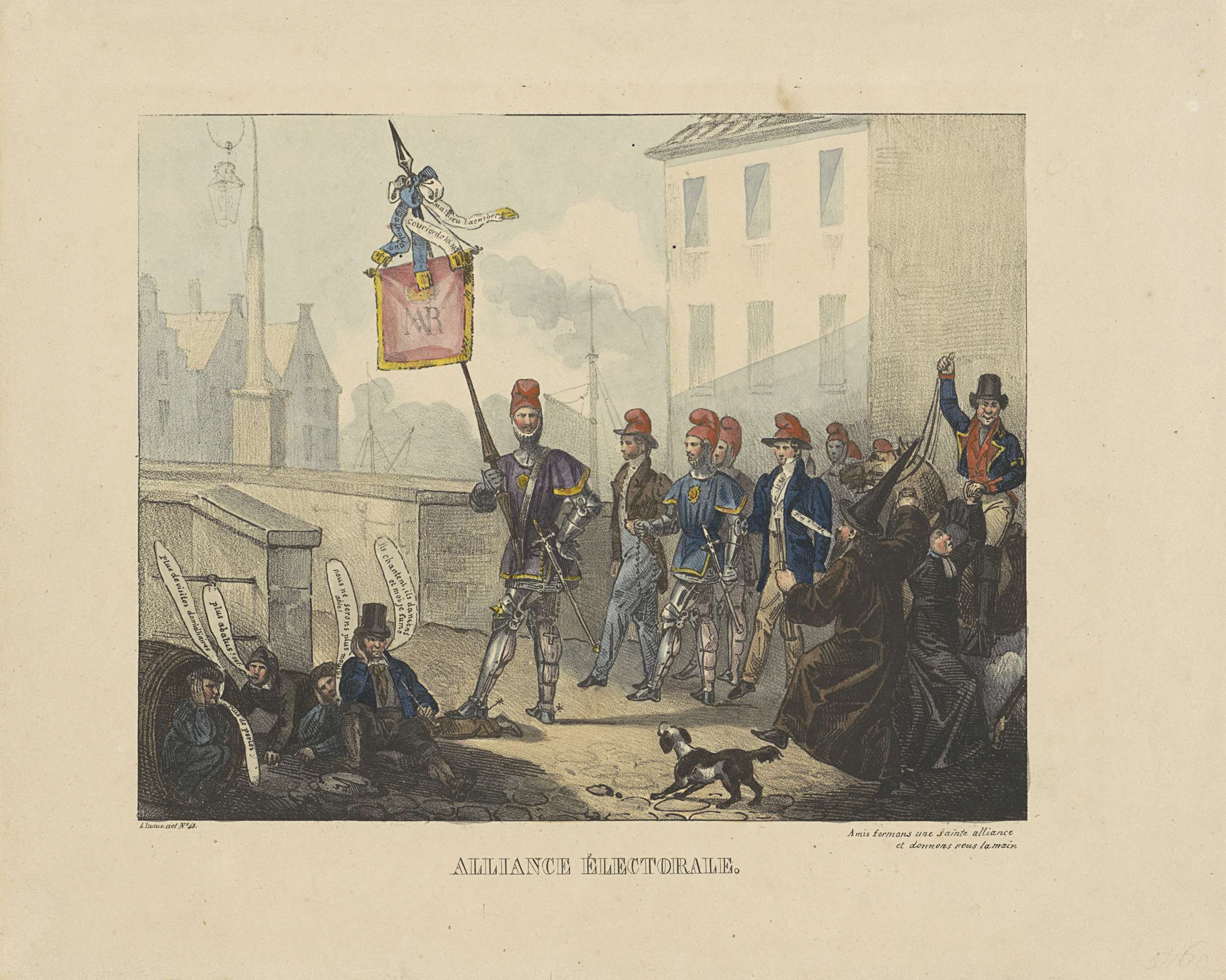 Spotprent op de alliantie gesloten in de Zuidelijke Nederlanden tussen de roomse klerikale partij en de liberale partij tegen de Nederlandse regering, 23 juli 1828. Optocht van mannen met jabobijnenmutsen en rozenkransen in de hand voorafgegaan door een ridder met een vaandel waarop de namen van drie bladen die de oppositie steunden. Rechts een man ...