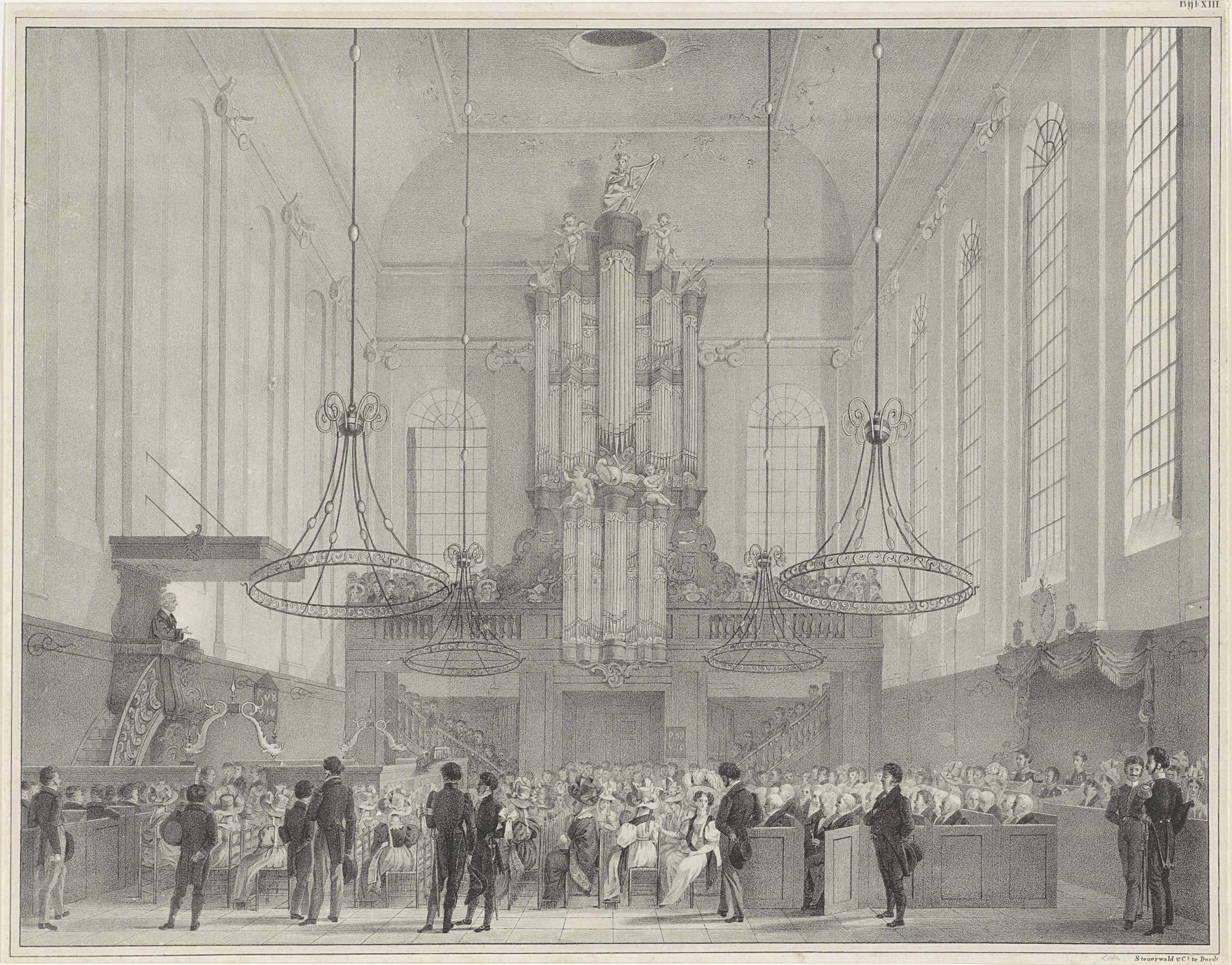 Prof. Johannes Henricus van der Palm als redenaar in de Lutherse kerk te Den Haag, de gelegenheid bijgewoond door de Koninklijke familie, augustus 1828. Waarschijnlijk gaat het hier om de feestelijke viering van het bereiken van de academische leeftijd van nakomelingen van koning Willem I. Rechtsboven gemerkt: Bijl: XIII. Zie ook de ontwerptekening.