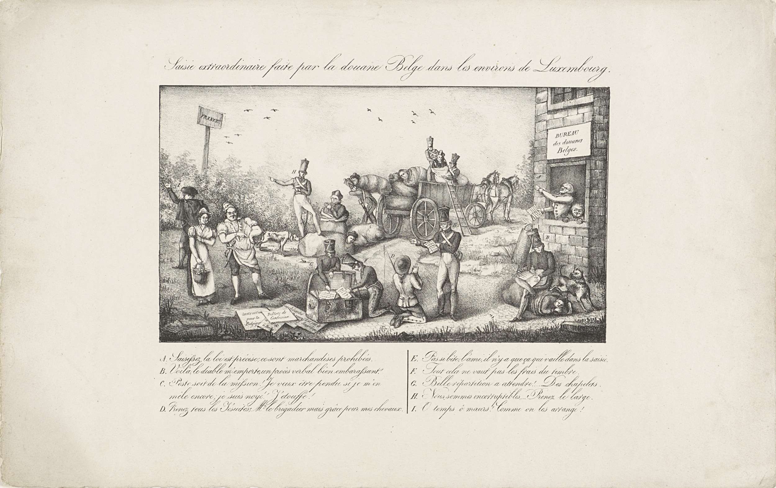 Bij de grens tussen de Zuidelijke Nederlanden en Frankrijk, nabij Luxemburg, vindt de douane bij controle jezuïeten die het land in proberen te komen. Ze zitten verstopt in zakken op een boerenkar. Rechts een douanekantoor, links zien een lachende kok en keukenmeid toe. In het midden onderzoeken twee douaniers een koffer vol Franse reactionaire wetten. ...