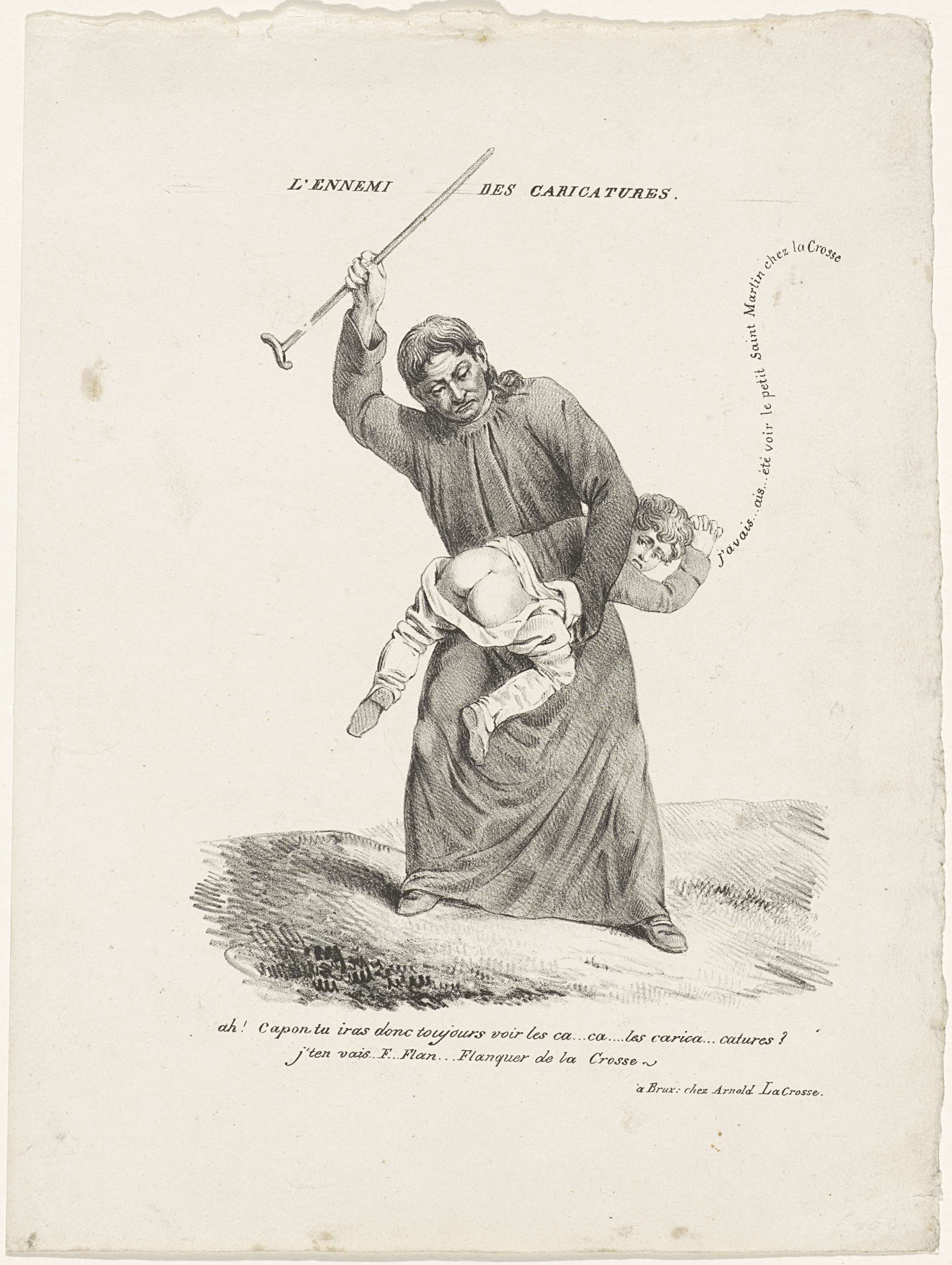 Spotprent waarin een priester een jongetje op zijn blote billen slaat als straf voor het kijken naar spotprenten. Spotprent tegen de groeiende invloed van de roomse geestelijkheid in het onderwijs en maatschappelijk leven, 1828.