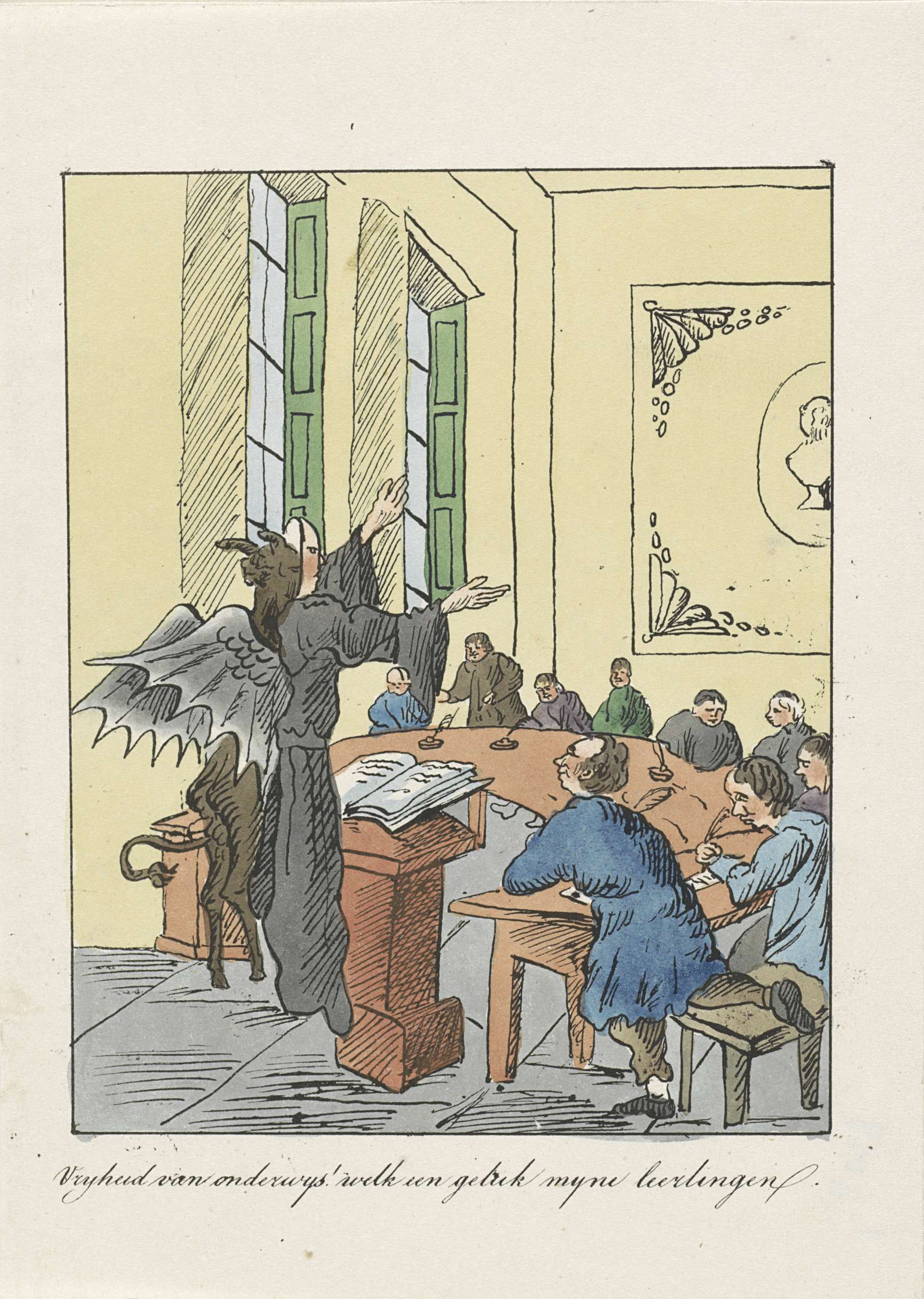 Een duivel met het masker en kleed van een geestelijke geeft les aan een groep leerlingen. Onderdeel van een groep van vier spotprenten op de Belgische petitiën voor vrijheid van onderwijs, drukpers en ministeriële verantwoordelijkheid, 1828-1830.