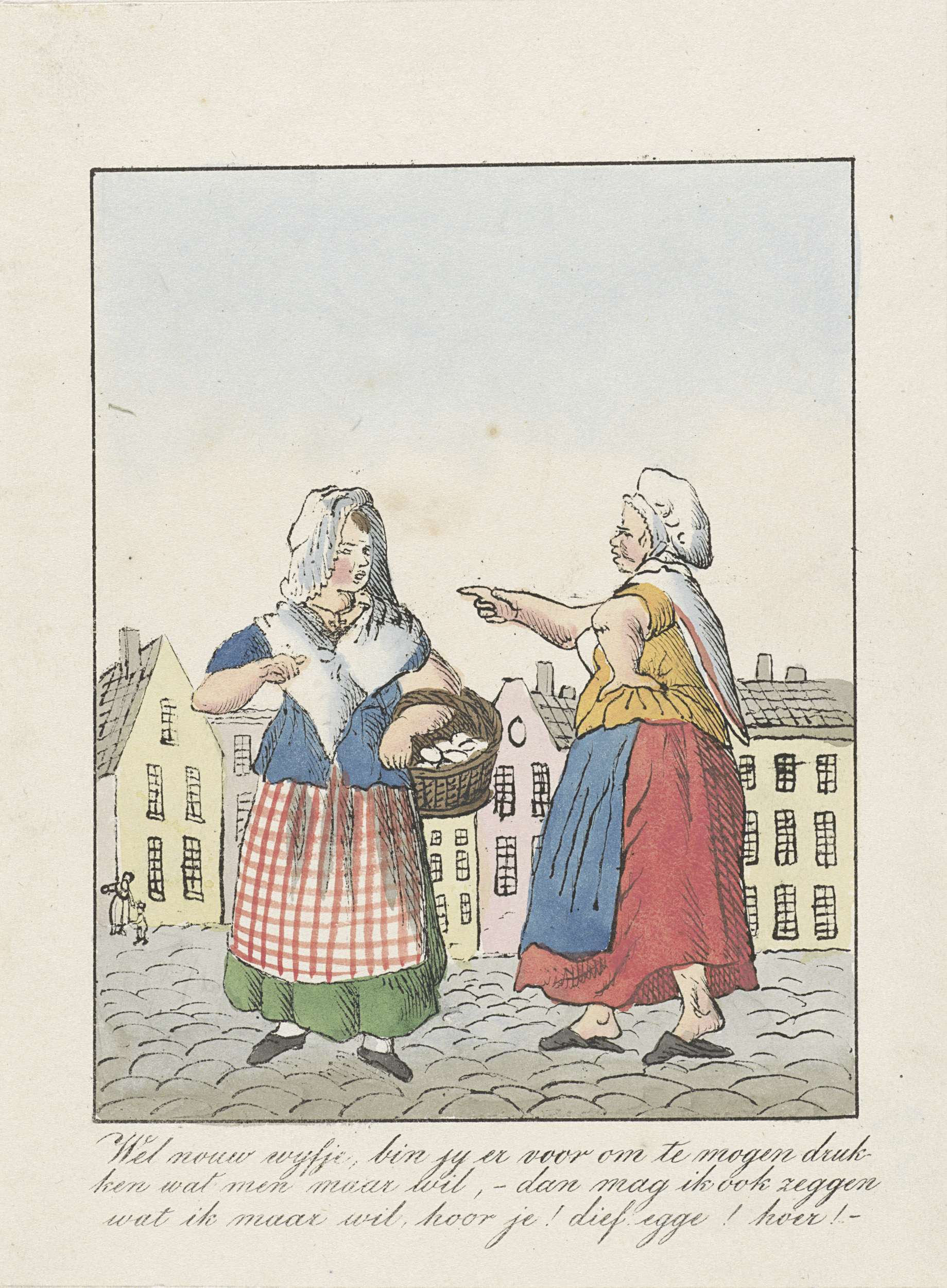 Twee vrouwen op straat, onder de mom van vrijheid van menigsuiting scheldt de één de ander uit. Onderdeel van een groep van vier spotprenten op de Belgische petitiën voor vrijheid van onderwijs, drukpers en ministeriële verantwoordelijkheid, 1828-1830.