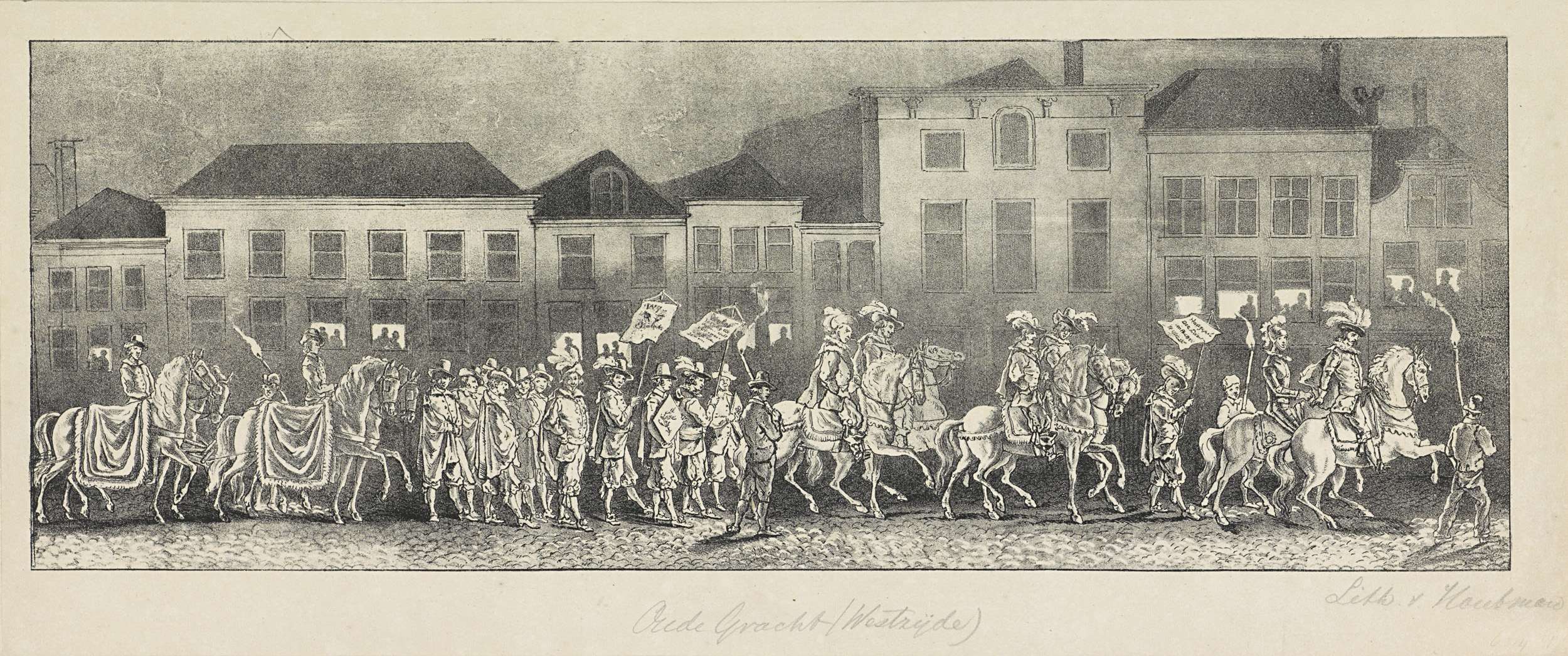 Optocht in maskerade van Utrechtse studenten ter viering van de Dies Natalis van de universiteit van Utrecht op 26 maart 1829. Plaat 1: Het begin van de stoet ruiters en voetvolk met brandende toortsen op de westzijde van de Oudegracht. Onderdeel van een groep van zeven platen die samen een lange fries vormen.