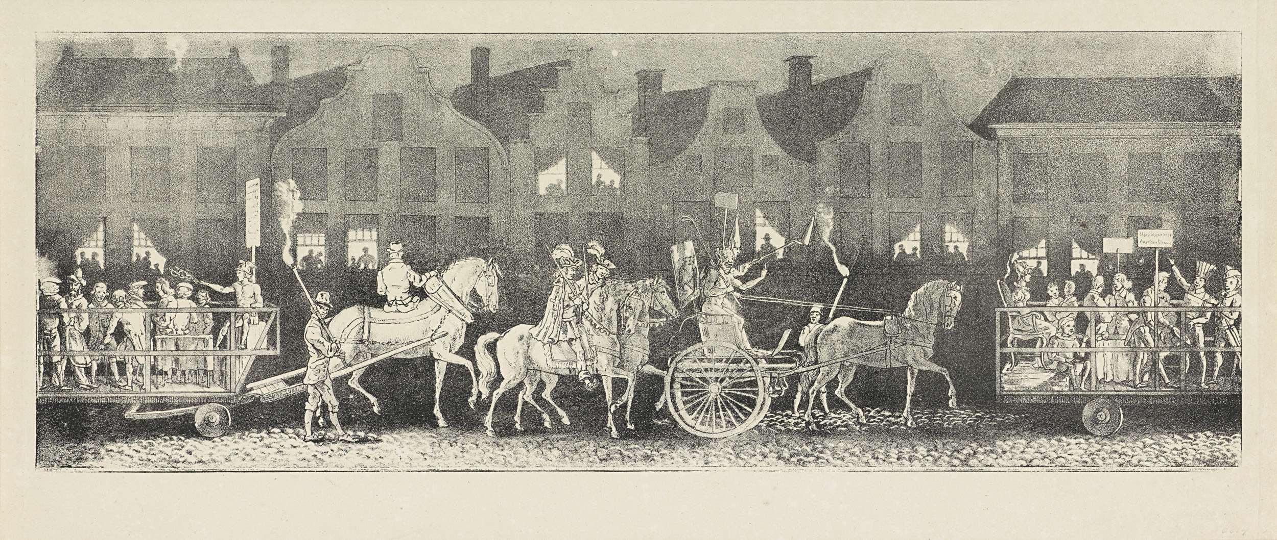 Optocht in maskerade van Utrechtse studenten ter viering van de Dies Natalis van de universiteit van Utrecht op 26 maart 1829. Plaat 3: Stoet met twee praalwagens met allegorische voorstellingen en een strijdwagen met de duivel. Onderdeel van een groep van zeven platen die samen een lange fries vormen.