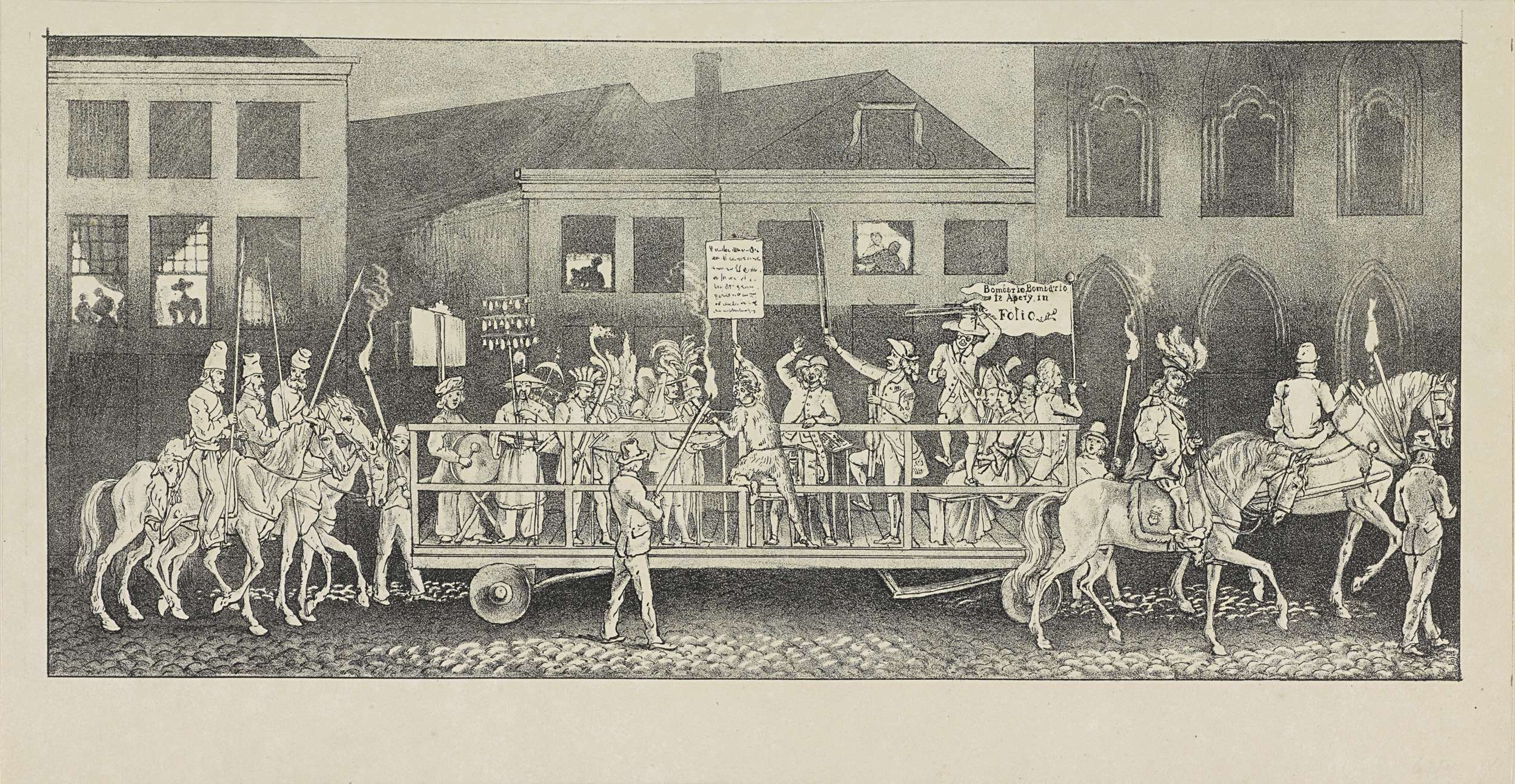 Optocht in maskerade van Utrechtse studenten ter viering van de Dies Natalis van de universiteit van Utrecht op 26 maart 1829. Plaat 7: Einde van de stoet met ruiters en een praalwagen over Bombario en muzikanten. Onderdeel van een groep van zeven platen die samen een lange fries vormen.