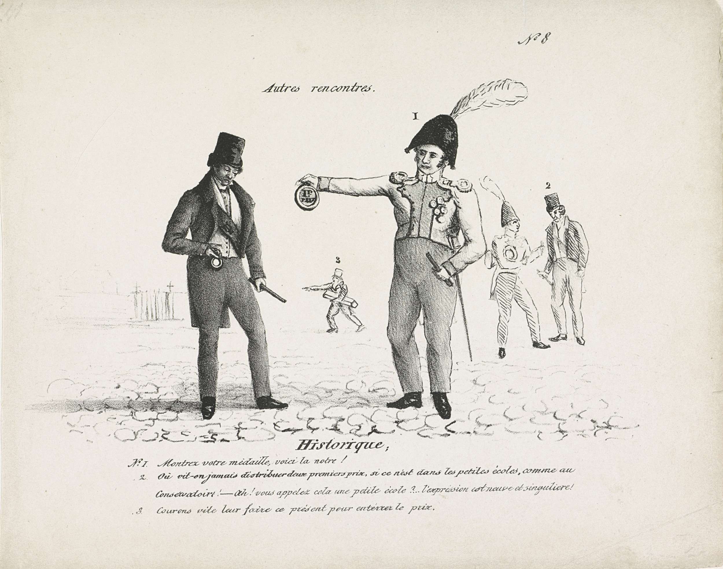 Spotprent op het muziekconcours gehouden te Lille op 30 juni 1829. De Gentse kapelmeester d'Hollander (in uniform) toont De Munck van Brussel zijn eerste prijs, een medaille met inscriptie. De Munck van Brussel bekijkt ook zijn medaille voor de eerste prijs, deze medaille is echter blanco, zonder inscriptie. Met legenda 1-3. Er ontstond onenigheid of ...