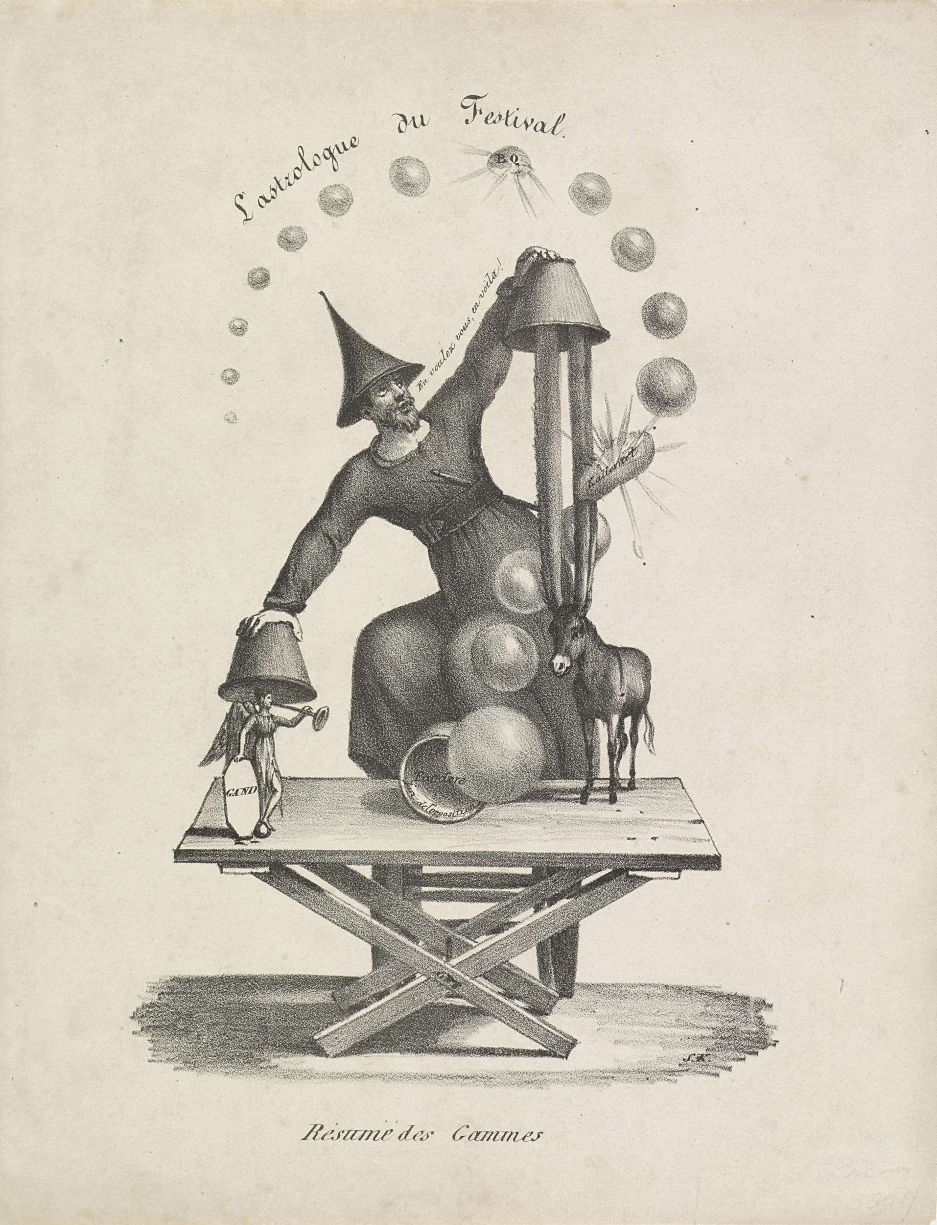 Spotprent op het muziekconcours gehouden te Lille op 30 juni 1829. Een goochelaar op een stellage tilt links een beker op waaronder een beeldje van Victoria voor Gent, onder de beker rechts een ezel met enorm lange oren. In het midden de geopende doos van Pandora waaruit zeepbellen opstijgen. Er ontstond onenigheid of de Vereeniging ...