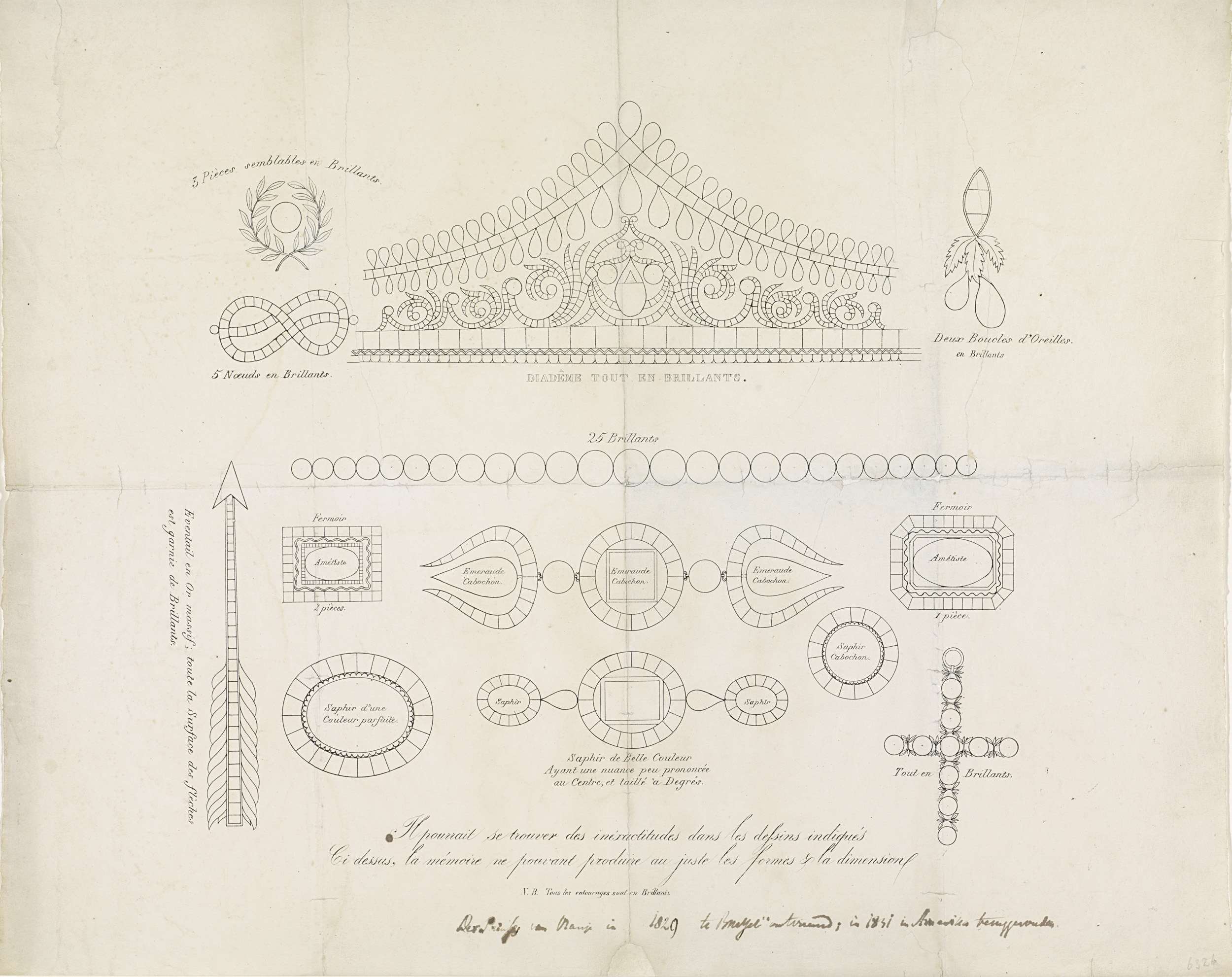 Afbeelding van de verschillende juwelen en sieraden gestolen uit het paleis van de prins en prinses van Oranje te Brussel op 26 september 1829. Onder andere een diadeem, een parelketting en verschillende broches.