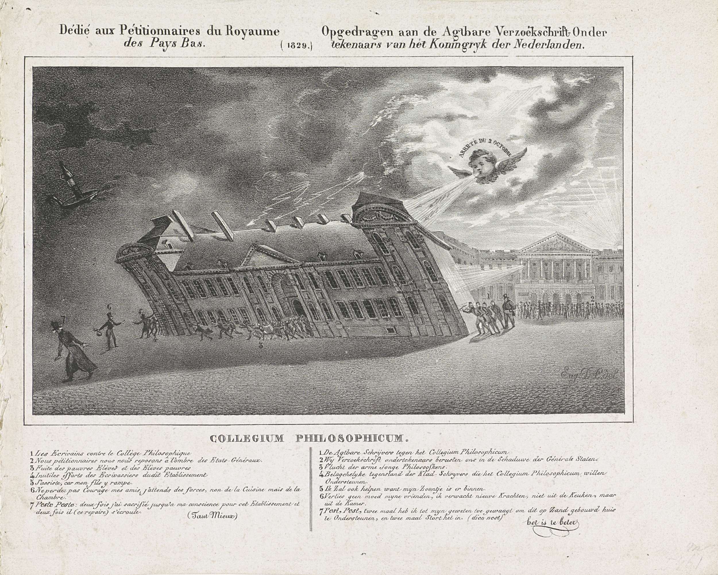 Spotprent op de opheffing van het Collegium Philosophicum, bij Koninklijk Besluit op 2 oktober 1829. Het gebouw van het Collegium Philosophicum wordt door de wind van het Koninklijk Besluit omver geblazen. Op de achtergrond in de stralende zon het gebouw van de Staten-generaal te Brussel. Met legenda's in het Frans en Nederlands 1-7.