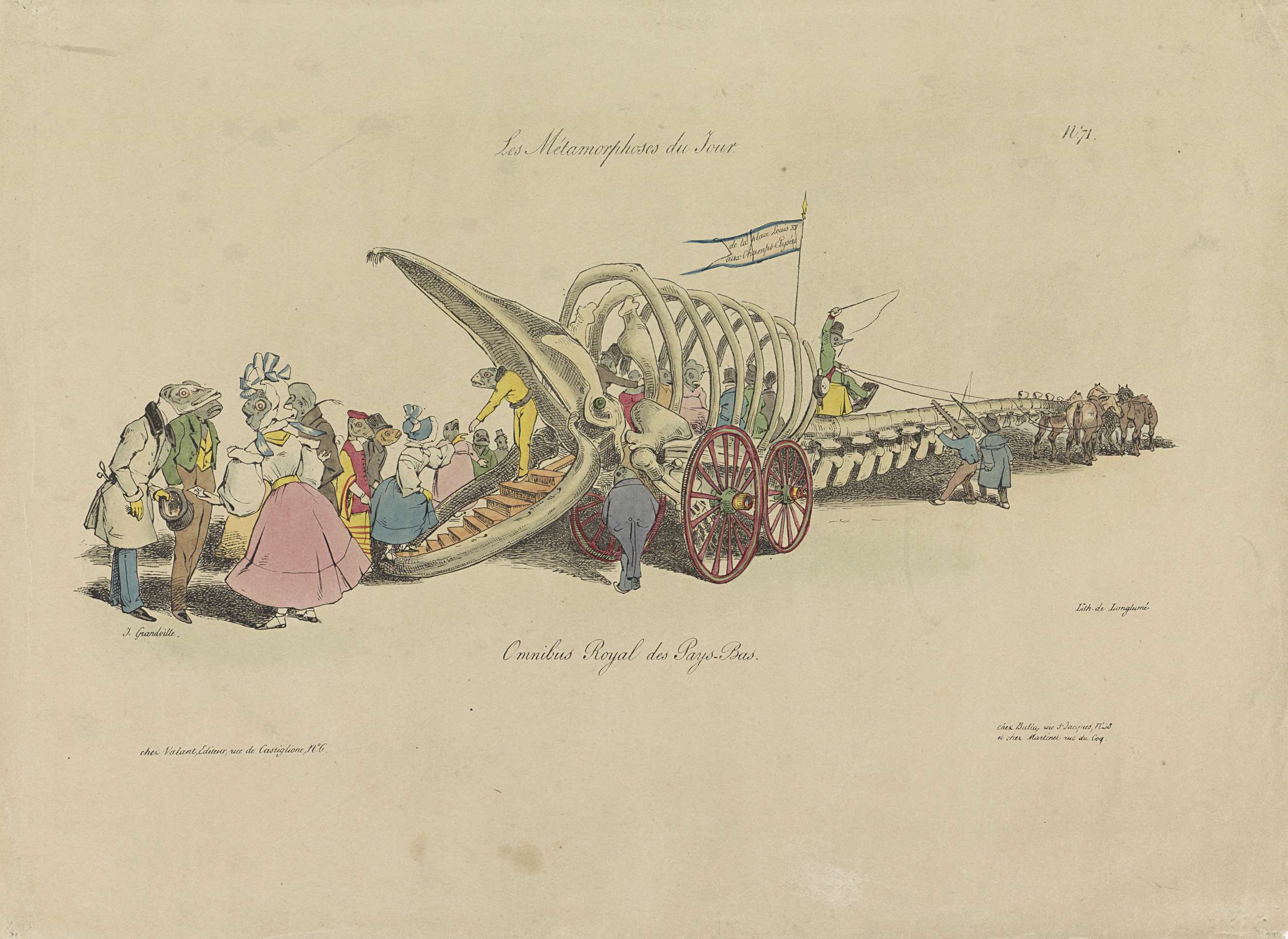 Spotprent op het rondreizen van Herman Kessels met de te Oostende gestrande walvis, november 1829. Het geraamte van de walvis omgebouwd tot een omnibus, een reiswagen waarin mensen in de gedaante van vissen plaats nemen. Genummerd rechtsboven: No. 71.