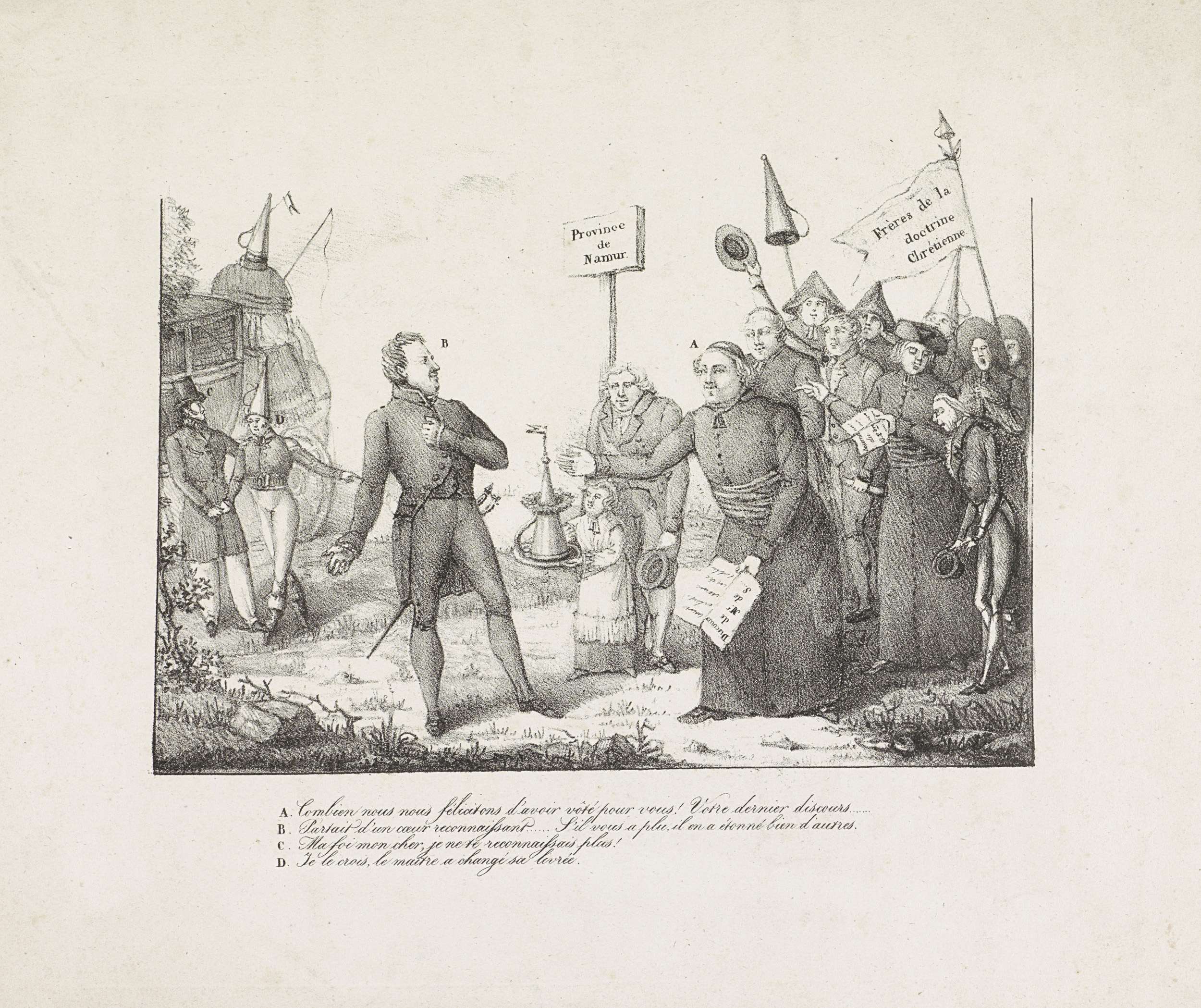 Spotprent op Goswin Joseph Augustin, baron de Stassart, 1829. Stassart was vroeger zeer liberaal, maar wordt later als vertegenwoordiger in de Tweede Kamer van de provincie Namen hevig klerikaal bij de debatten over het Collegium Philosophicum en maakt zich in 1829 sterk voor de grieven door België ingebracht. Stassart staande bij de grens met de ...