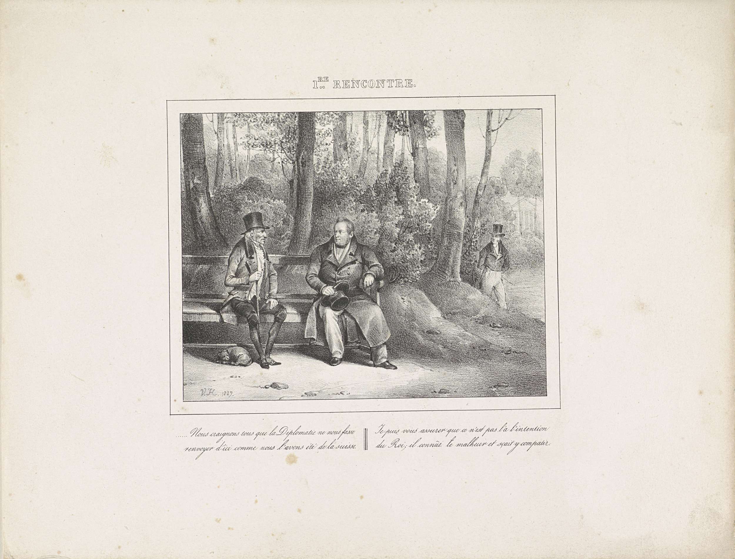 De koning sprekend in het park van Brussel met een man uit Zwitserland verdreven. Met vierregelig onderschrift. Onderdeel van de serie van 24 platen met ontmoetingen met koning Willem I, verschenen onder de titel 'Les rencontres' in 1829-1830.