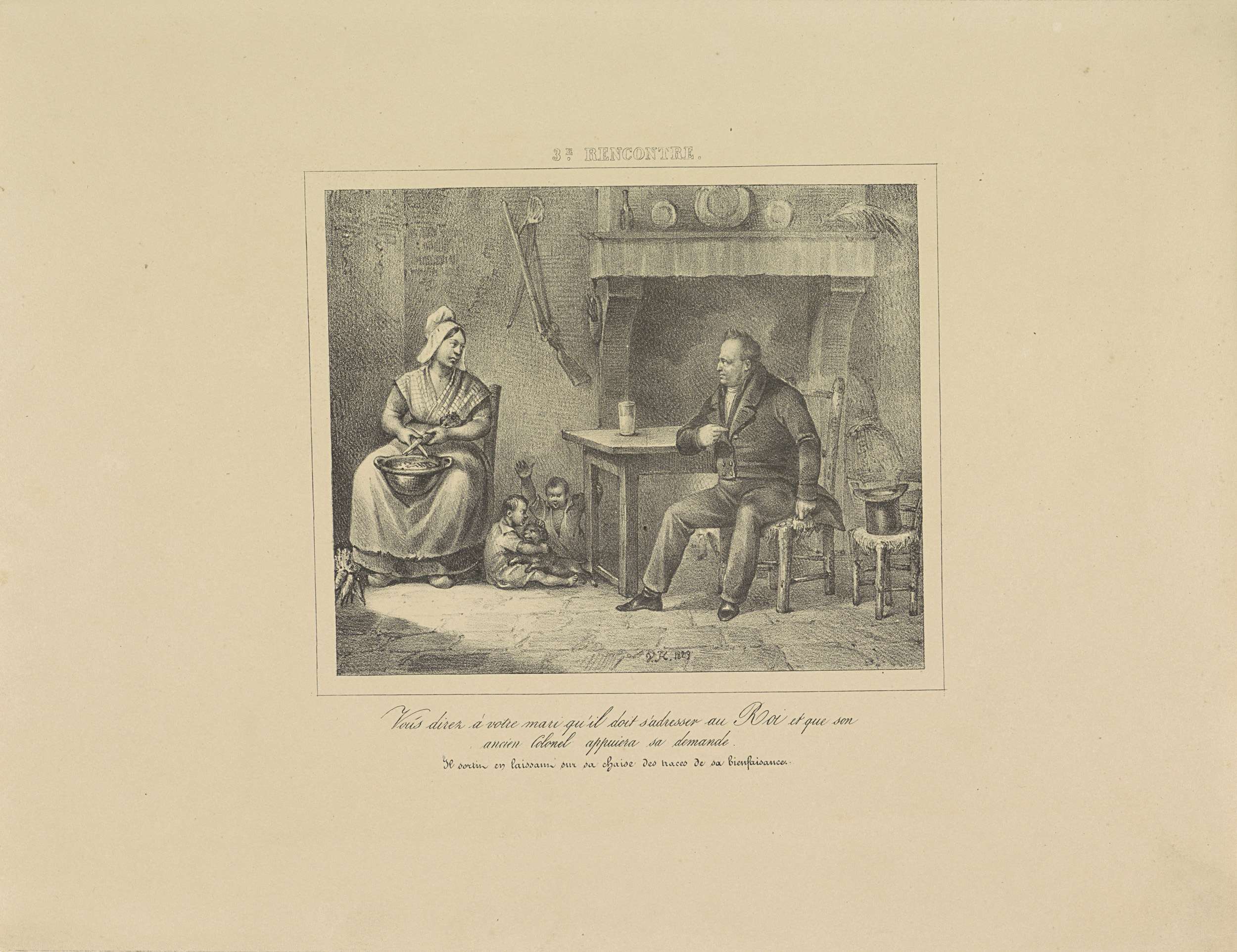 De koning in een eenvoudige boerenwoning sprekend met de boerin. Ondertussen legt hij enkele geldstukken op zijn stoel. Met drieregelig onderschrift. Onderdeel van de serie van 24 platen met ontmoetingen met koning Willem I, verschenen onder de titel 'Les rencontres' in 1829-1830.