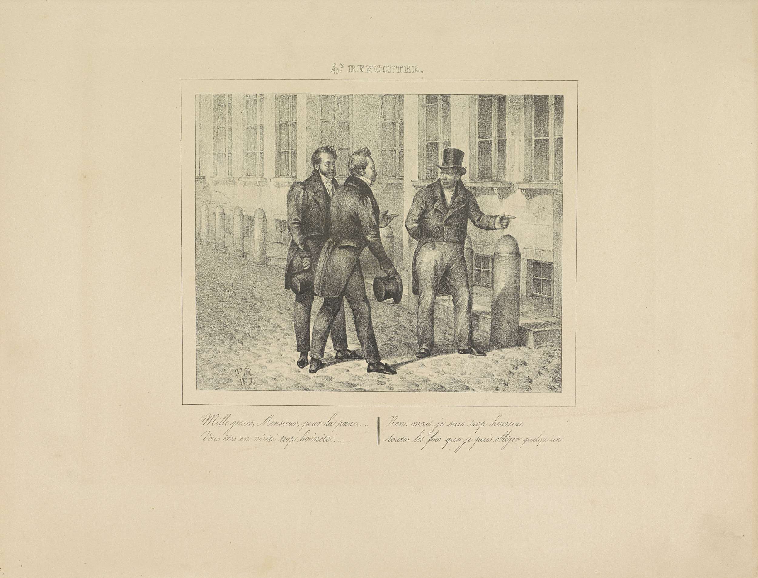 De koning wijst op straat twee mannen de weg. Met vierregelig onderschrift. Onderdeel van de serie van 24 platen met ontmoetingen met koning Willem I, verschenen onder de titel 'Les rencontres' in 1829-1830.