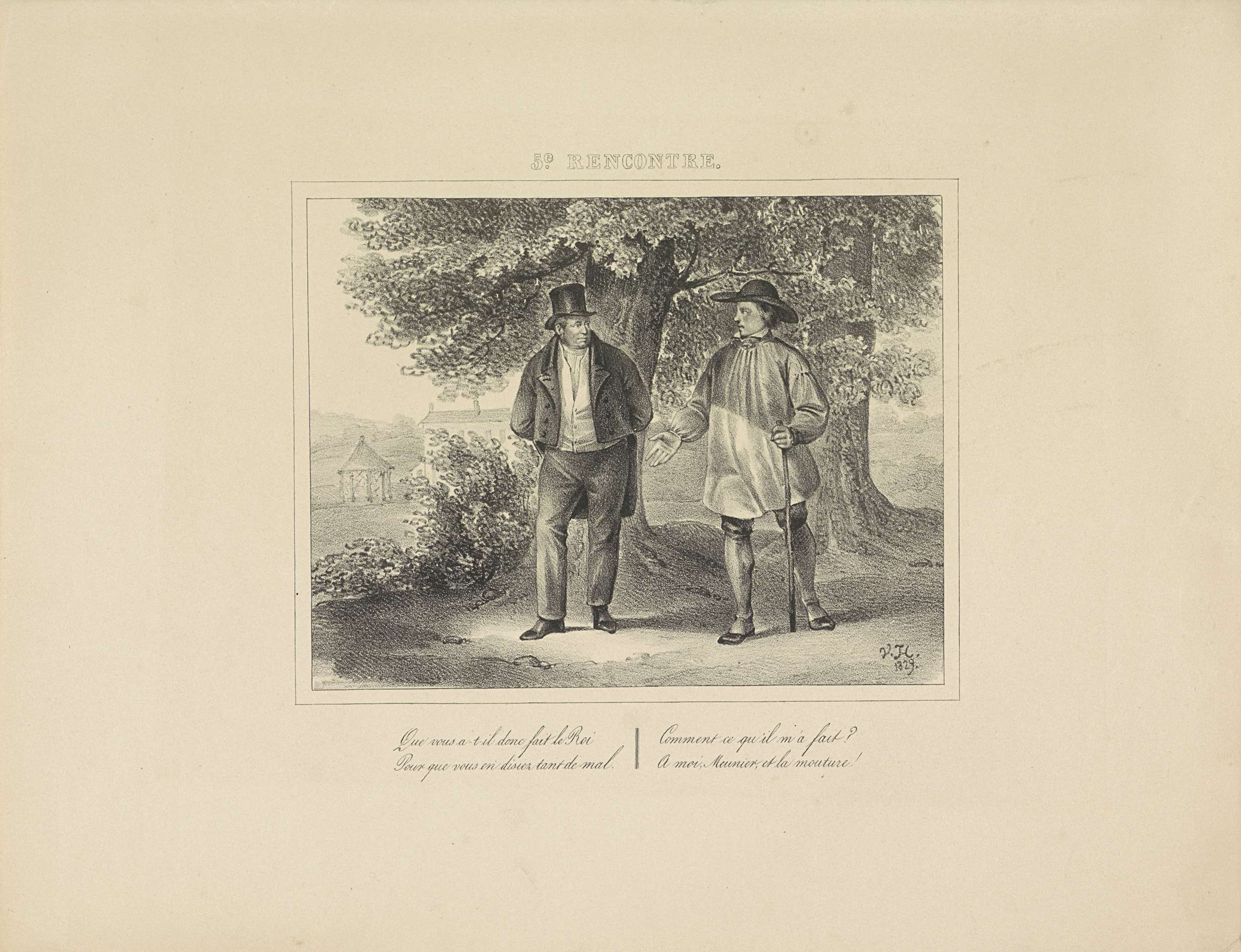 De koning wandelend en sprekend met een molenaar die hem niet heeft herkend. Met vierregelig onderschrift. Onderdeel van de serie van 24 platen met ontmoetingen met koning Willem I, verschenen onder de titel 'Les rencontres' in 1829-1830.