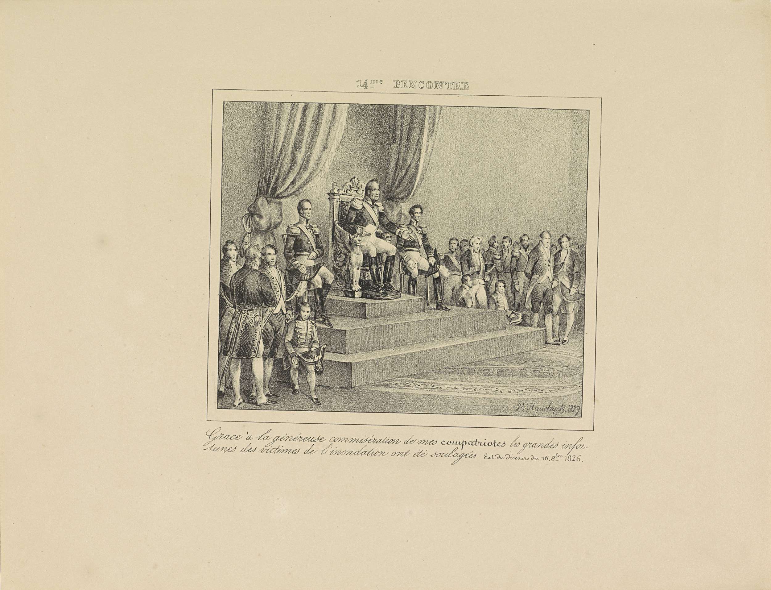 Koning Willem I dankt bij opening van de Kamers op 16 oktober 1826 zijn landgenoten voor de hulp verleend aan de slachtoffers van de watersnood. De koning zit op zijn troon. Aan weerszijden van hem zitten zijn zoons, de kroonprins en prins Frederik. Met tweeregelig onderschrift. Onderdeel van de serie van 24 platen met ontmoetingen ...