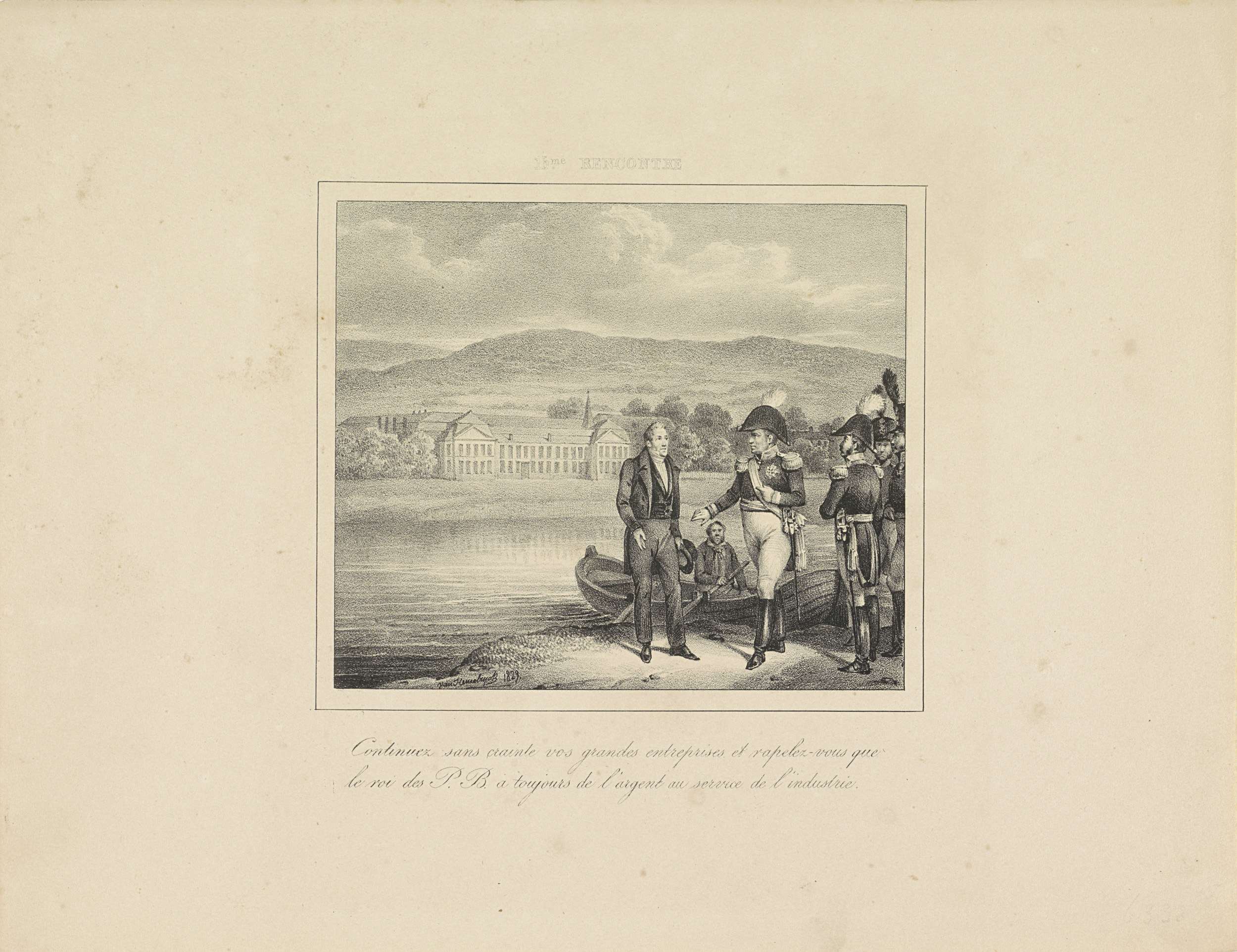 Koning Willem I ontmoet de industrieel John Cockerill en verzekert hem dat hij altijd geld overheeft voor de industrie van het land. Staande aan de oever van een meer met aan de overzijde het voormalige zomerpaleis van de prinsbisschoppen van Luik in Seraing waarin William Cockerill met zijn zoons John en James een grote fabriek ...