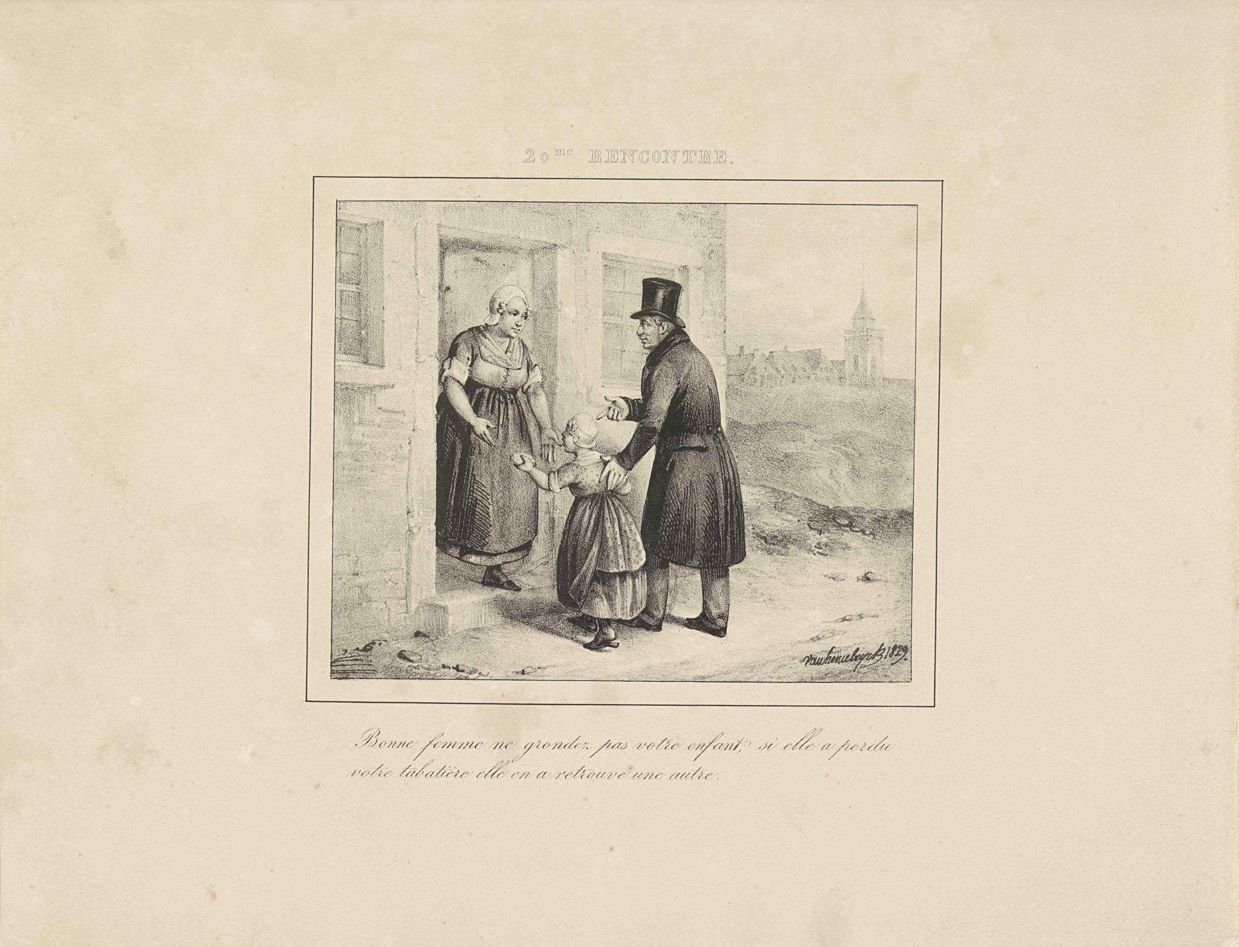 De koning brengt een jong meisje thuis, nadat zij de snuifdoos van haar moeder had verloren maar van hem een nieuwe had gehad. Met tweeregelig onderschrift. Onderdeel van de serie van 24 platen met ontmoetingen met koning Willem I, verschenen onder de titel 'Les rencontres' in 1829-1830.