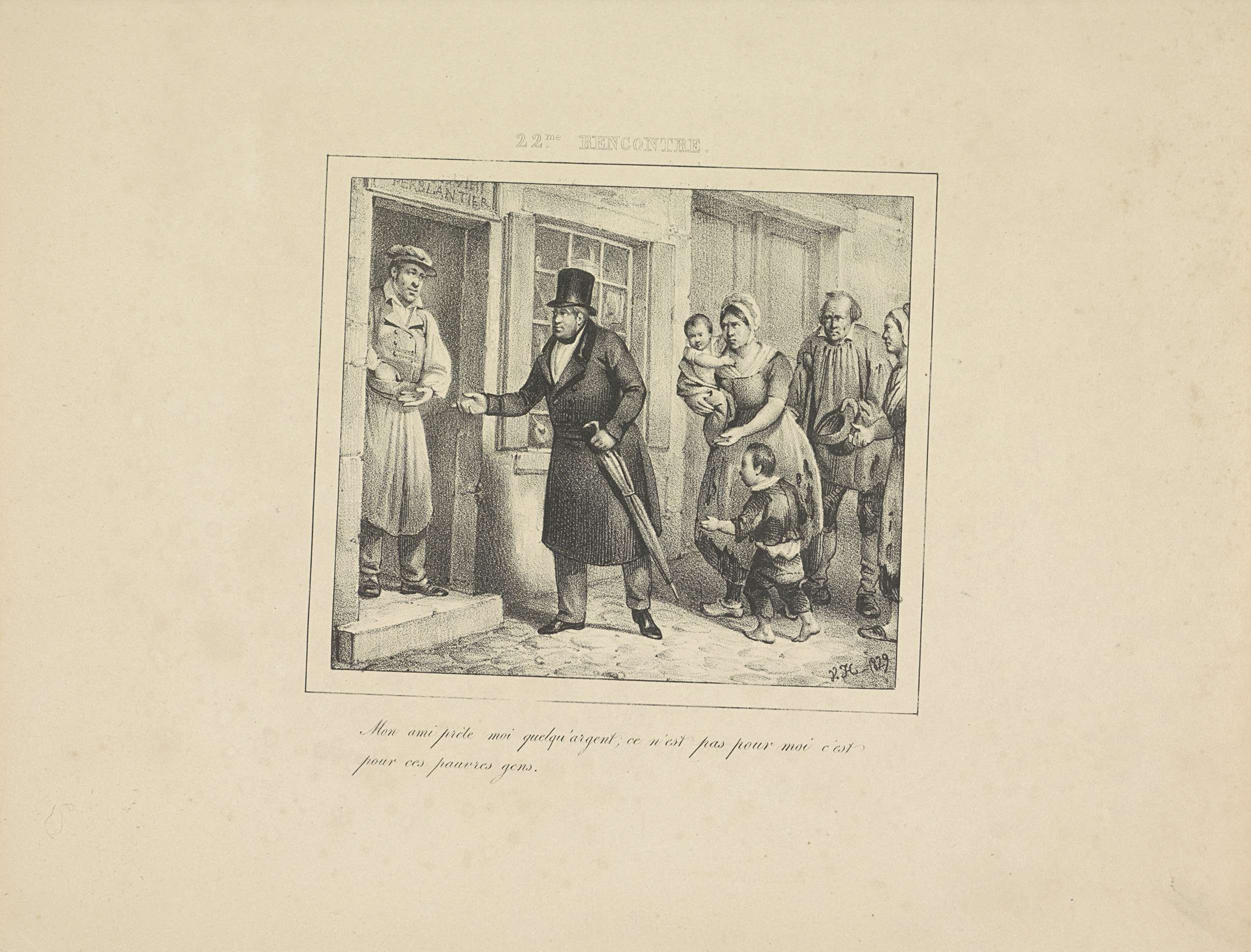 De koning leent bij een blikslager geld om aan de armen te geven die hij op straat heeft ontmoet. Met tweeregelig onderschrift. Onderdeel van de serie van 24 platen met ontmoetingen met koning Willem I, verschenen onder de titel 'Les rencontres' in 1829-1830.