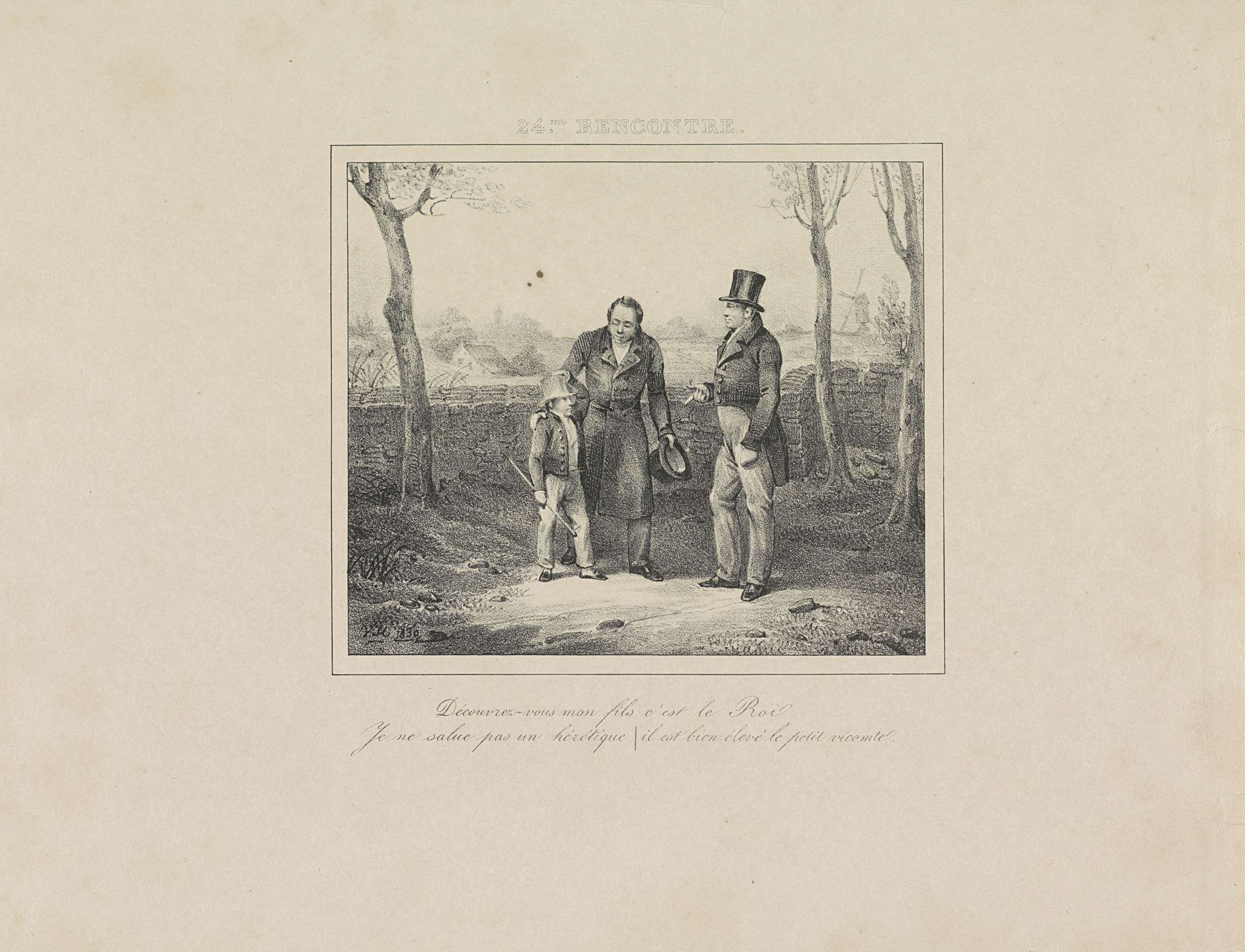 De koning ontmoet bij het wandelen een vader en zoon. Het kind weigert, op het verzoek van zijn vader, om zijn hoed voor de koning af te nemen met de woorden 'Je ne salue pas un hérétique'. Dit tot vermaak van de koning. Met tweeregelig onderschrift. Onderdeel van de serie van 24 platen met ontmoetingen ...