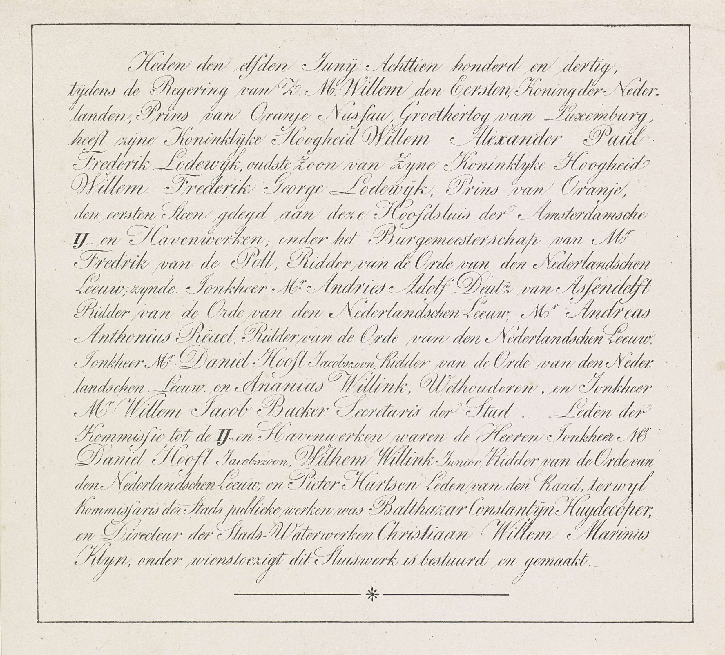 Afdruk van de inscriptie op de koperen plaat ingemetseld bij de legging van de eerste steen van de hoofdsluis der Amsterdamsche IJ- en Havenwerken aan de Oosterdoksdijk voor Amsterdam door de kroonprins op 11 juni 1830.