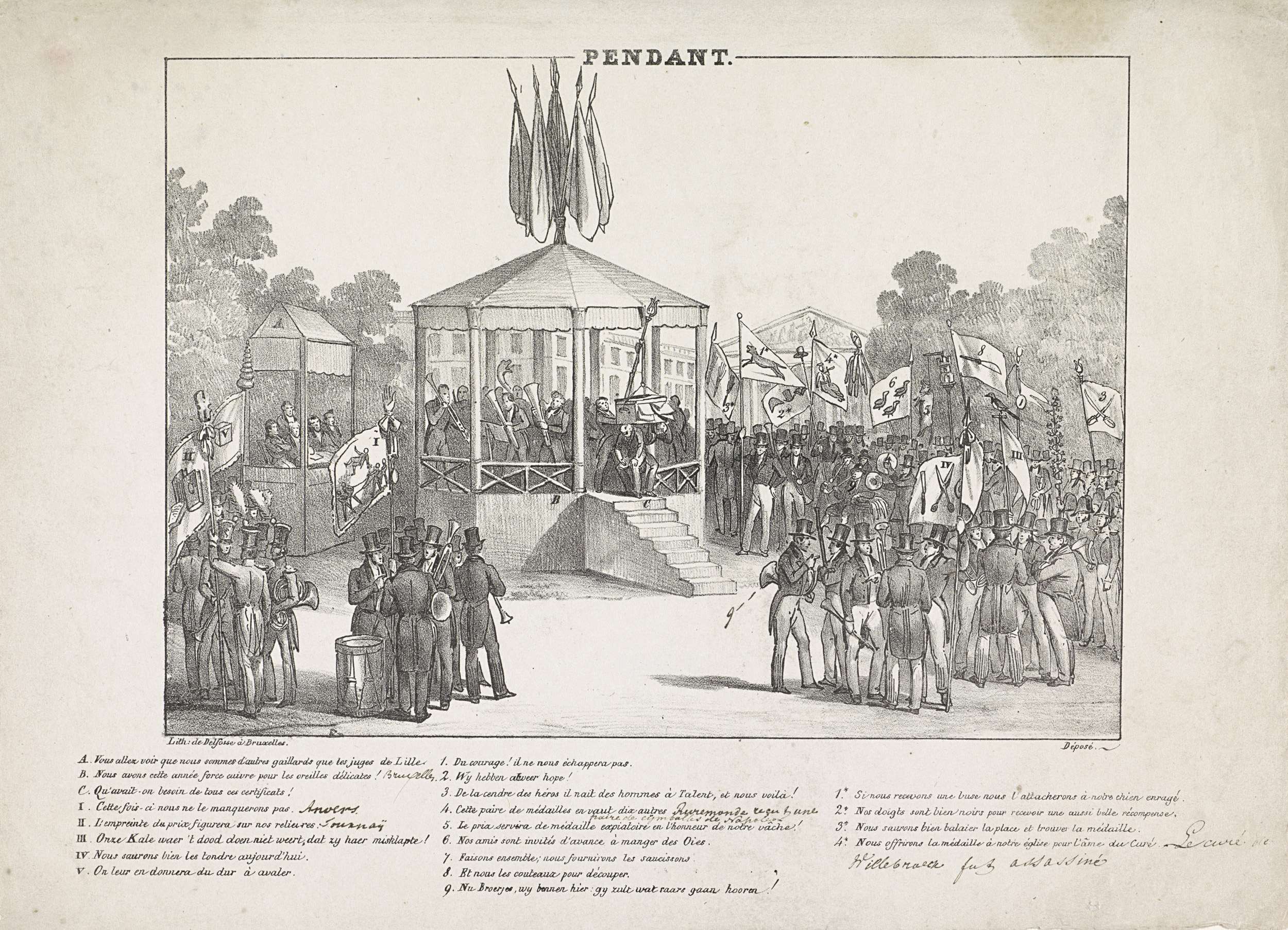 Spotprent op het muziekconcours gehouden te Brussel gelijktijdig met de Nationale Nijverheidtentoonstelling, juli 1830. Gezicht in het Parc Royale waar het concours wordt gehouden. Een harmonie speelt terwijl de andere muziekkorpsen op hun beurt wachten. Met legenda A-C, I-V, 1-9 en 1*-4*. In het onderschrift enkele met de hand geschreven opschriften. Onderdeel van een groep ...