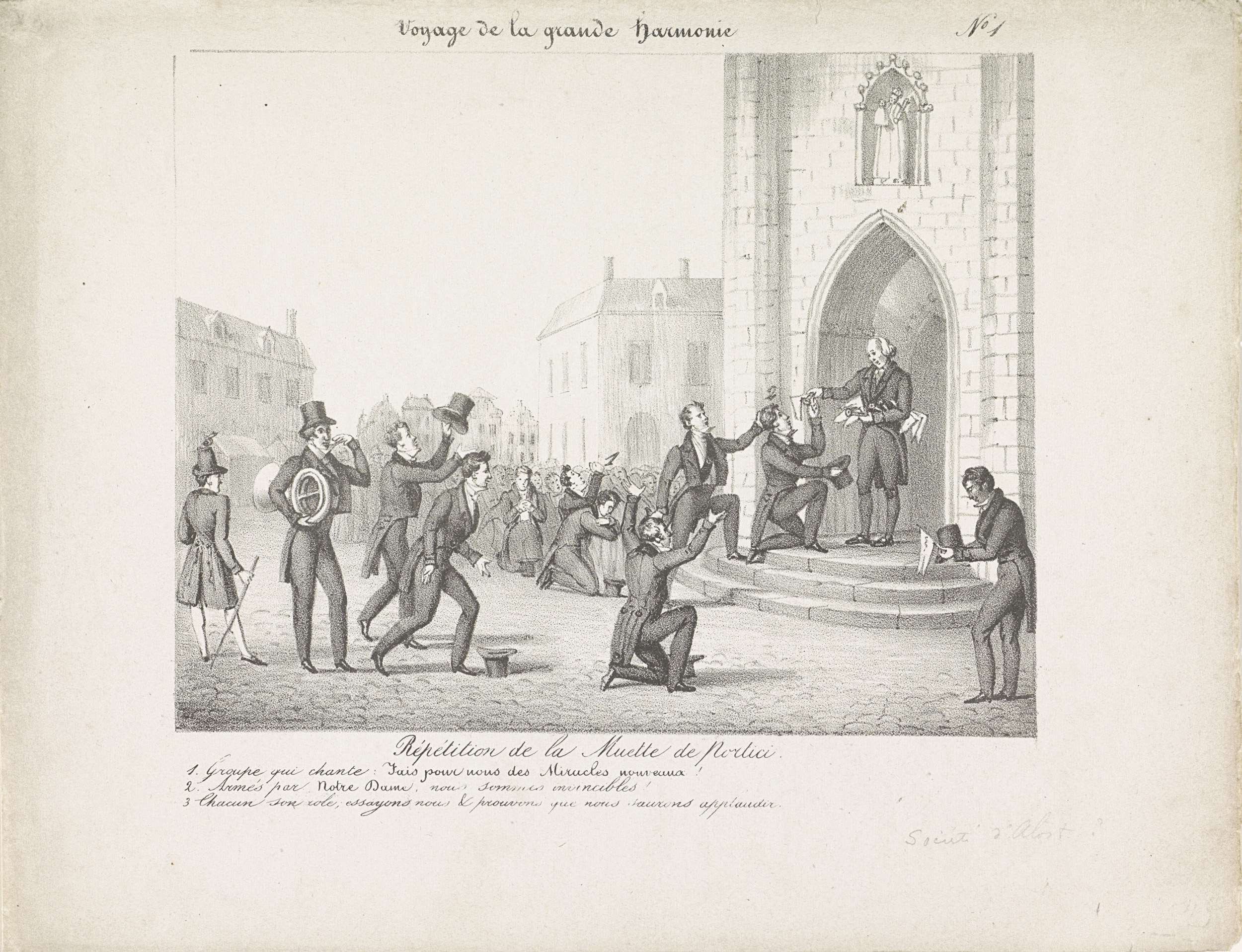 Spotprent op het muziekconcours gehouden te Lille op 30 juni 1829. De leden van de winnende muziekkorps van Brussel ontvangen knielend hun prijs bij de deur van de kerk. In het onderschrift de legenda 1-3. Genummerd rechtsboven: No. 1.