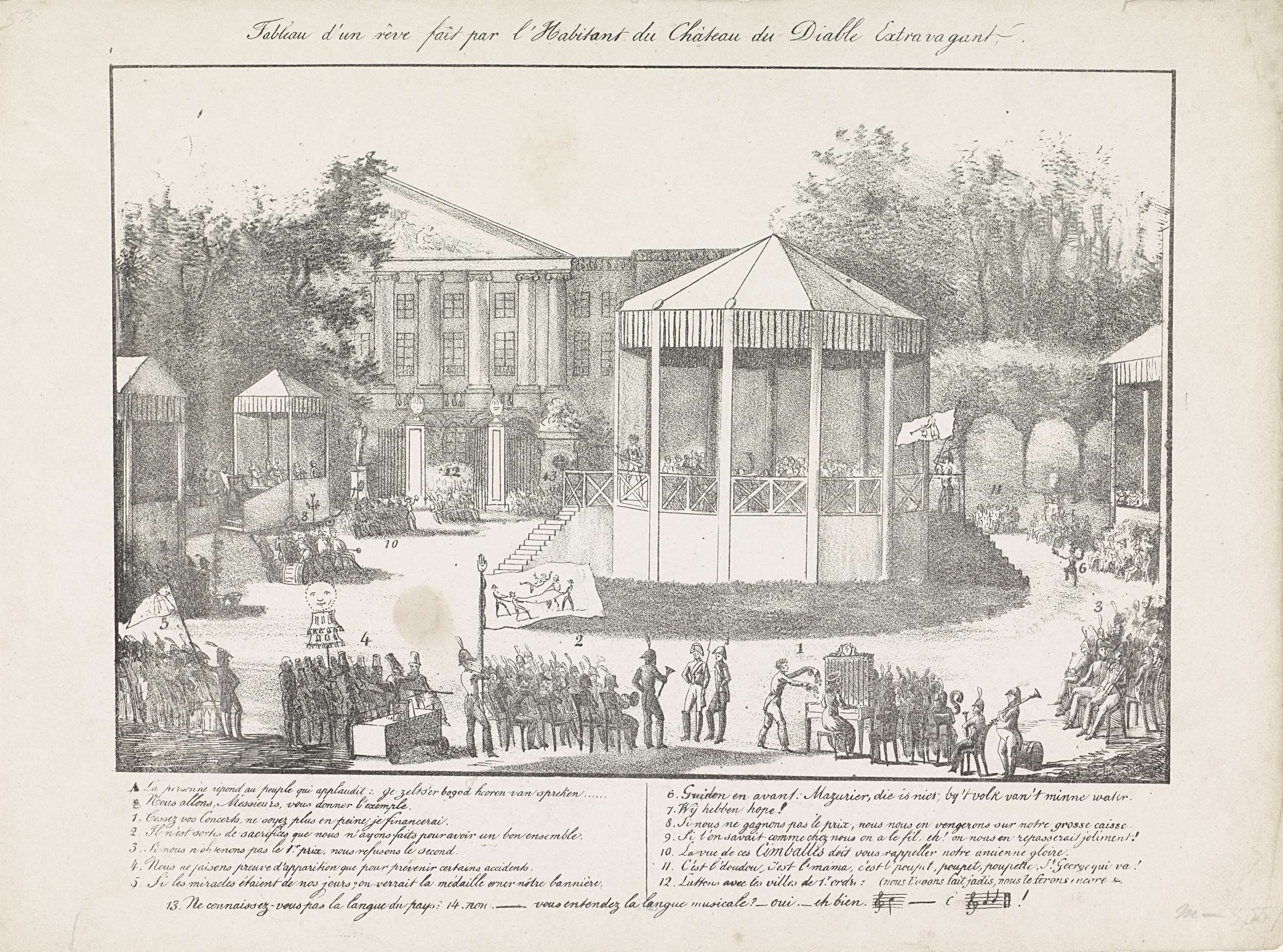Spotprent op het muziekconcours gehouden te Brussel in juli 1830. Gezicht op de muziektent in de Parc Royale waar het concours plaats vindt. Om de tent wachten de andere muziekkorpsen op hun beurt om te spelen. Links op de achtergrond het gebouw van de Staten-Generaal, daarvoor de tent met de jury. Met legenda A-B en ...