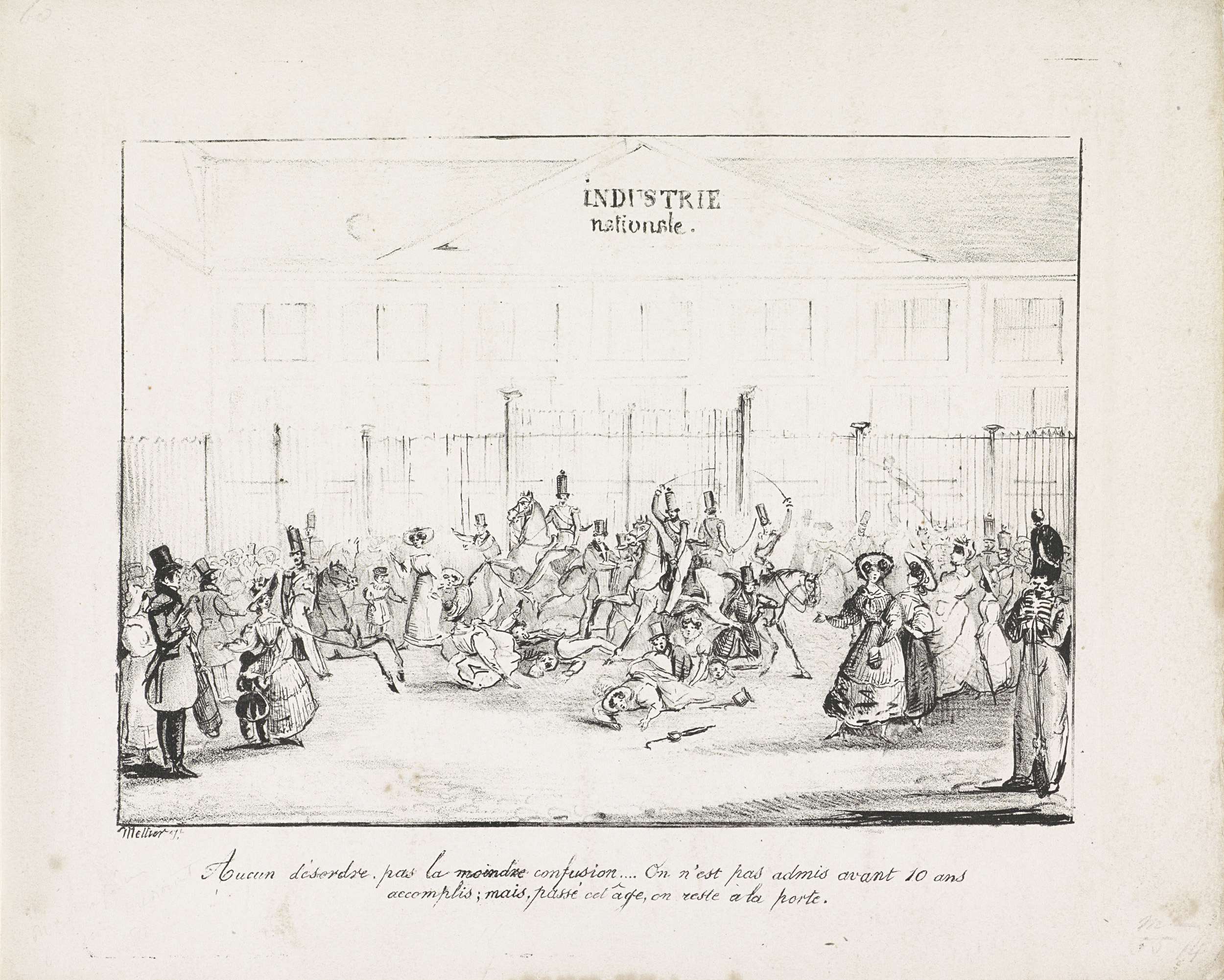 Spotprent op de ongeregeldheden bij de opening van het Palais d'Industrie tijdens de Nationale Nijverheidtentoonstelling te Brussel, juli 1830. De rellen ontstonden nadat sommige personen de toegang was ontzegd. De cavalerie hakt met sabels in op het publiek. Links en rechts kijkt het overige publiek toe. Met tweeregelig onderschrift.