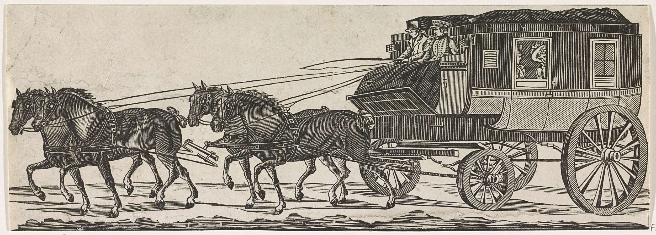 Diligence of reiskoets getrokken door vier paarden, ca. 1830. Twee man op de bok, binnenin enkele passagiers.