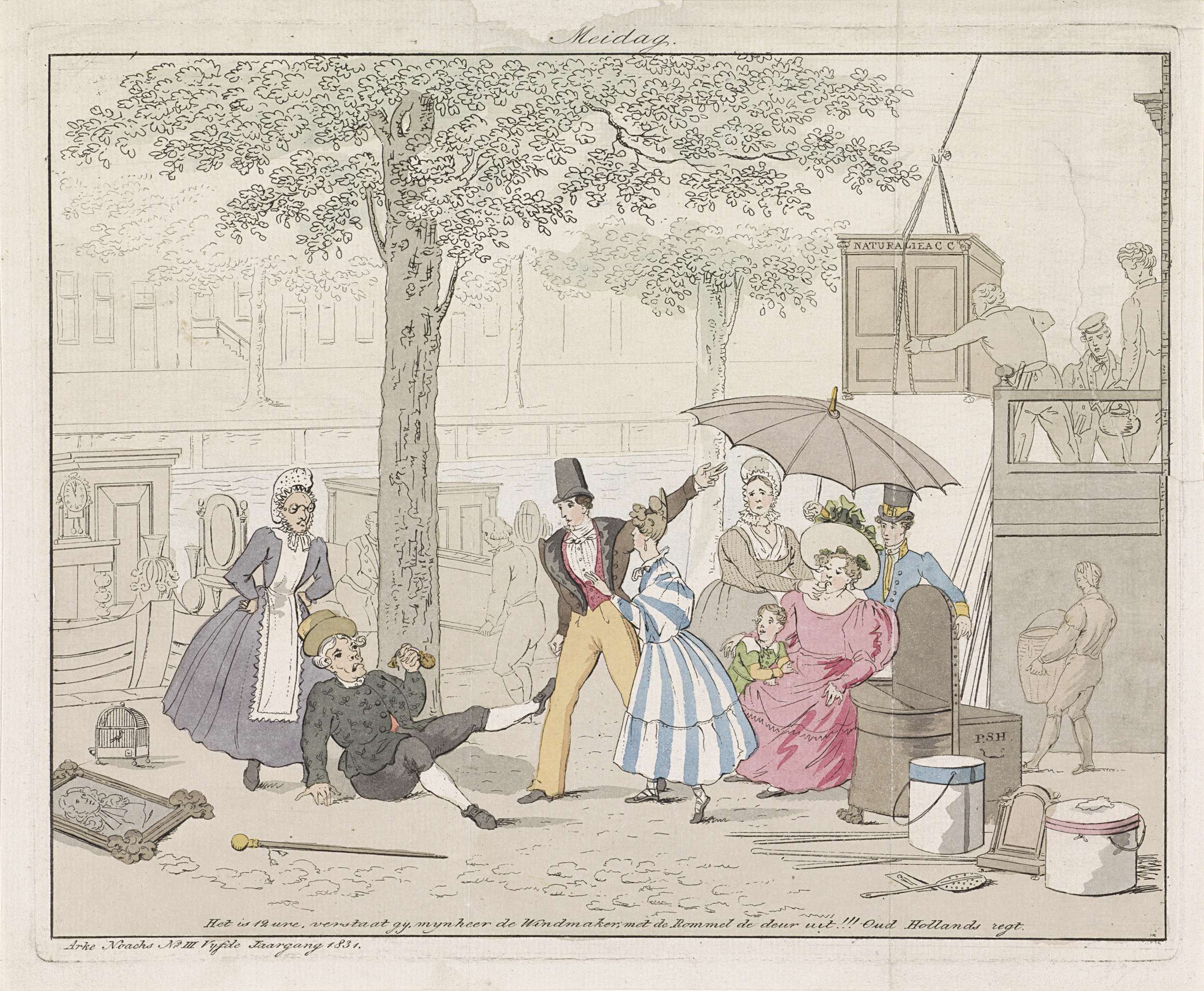 Spotprent op de perikelen rond een verhuizing in Amsterdam op 1 mei. De nieuwe bewoners van een grachtenpand, Doctor Urinaal en zijn vrouw Griet willen hun nieuwe woning betrekken, maar de vorige bewoners, de familie Naturalibus, zijn nog niet klaar met het verhuizen van hun spullen. Als het begint de regenen geeft doctor Urinaal met ...