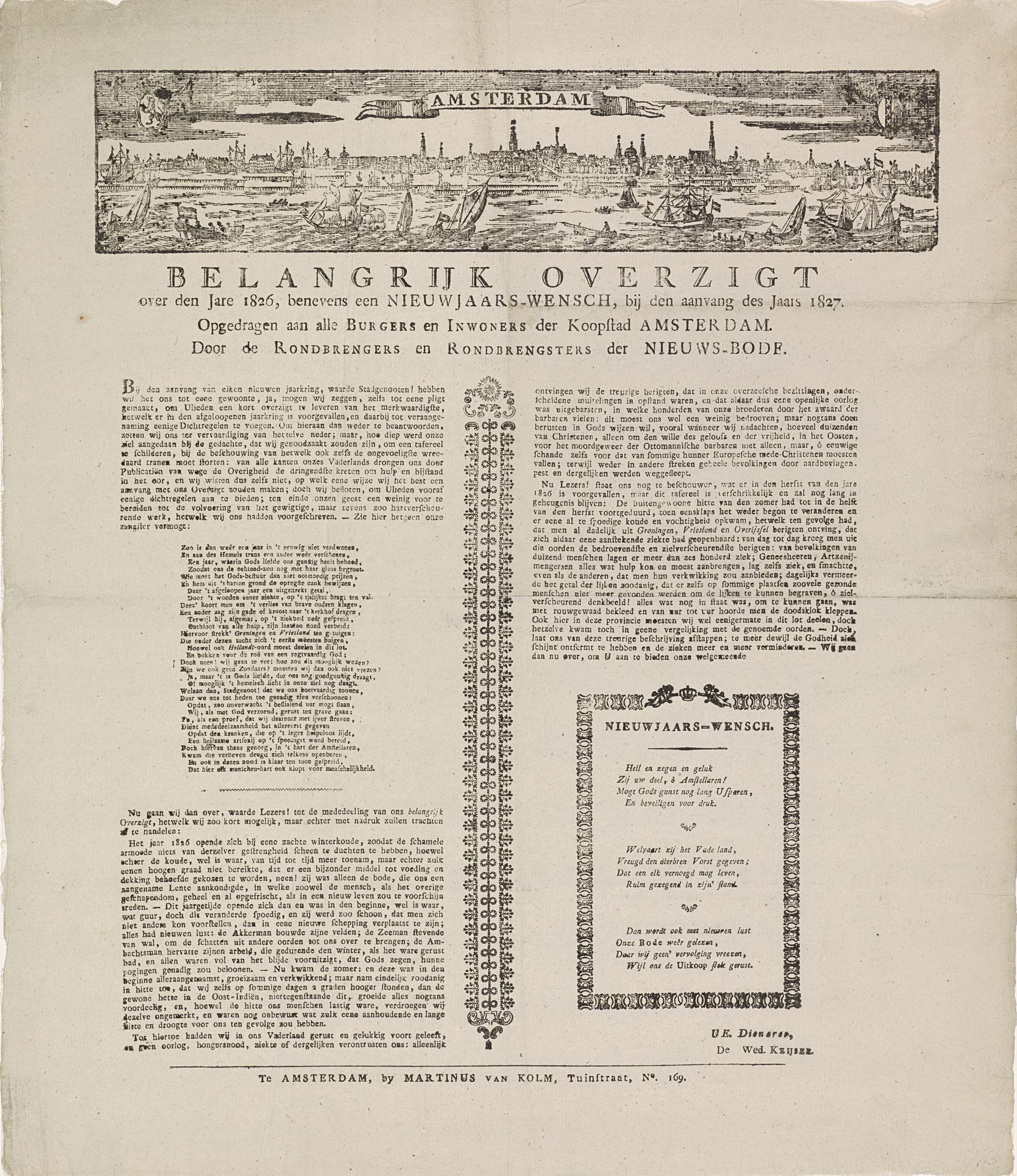 Nieuwjaarswens door de 'Rondbrengers en Rondbrengsters der Nieuws-Bode' te Amsterdam, 1827. Bovenaan een gezicht op Amsterdam van over het IJ. Met tekst in twee kolommen twee verzen en met nieuws over het afgelopen jaar 1826, voornamelijk het weer betreffende.