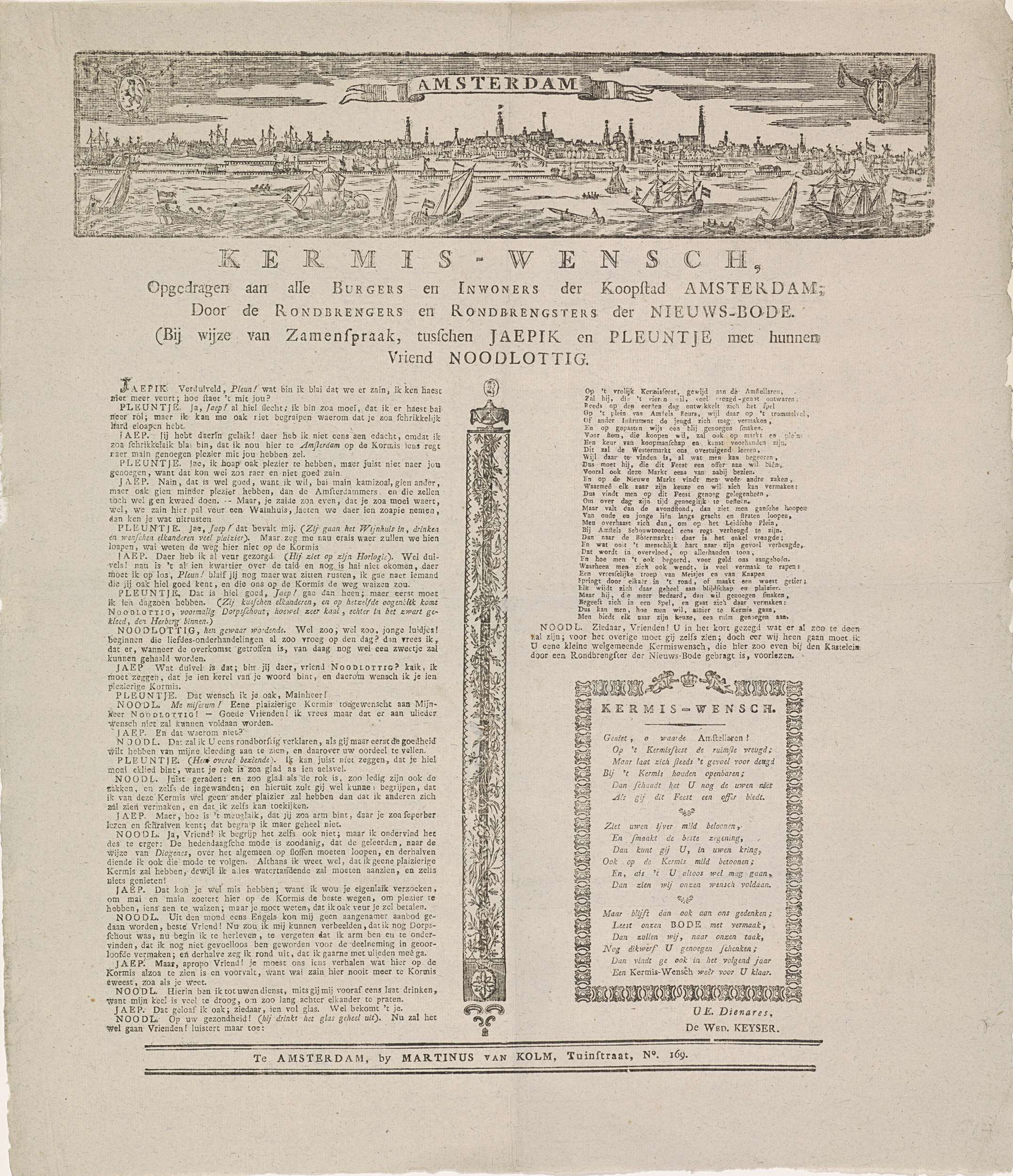 Kermiswens door de 'Rondbrengers en Rondbrengsters der Nieuws-Bode' te Amsterdam, ca. 1825-1830. Bovenaan een gezicht op Amsterdam van over het IJ. Met tekst in twee kolommen met een samenspraak tussen Jaepik, Pleuntje en Noodlottig.