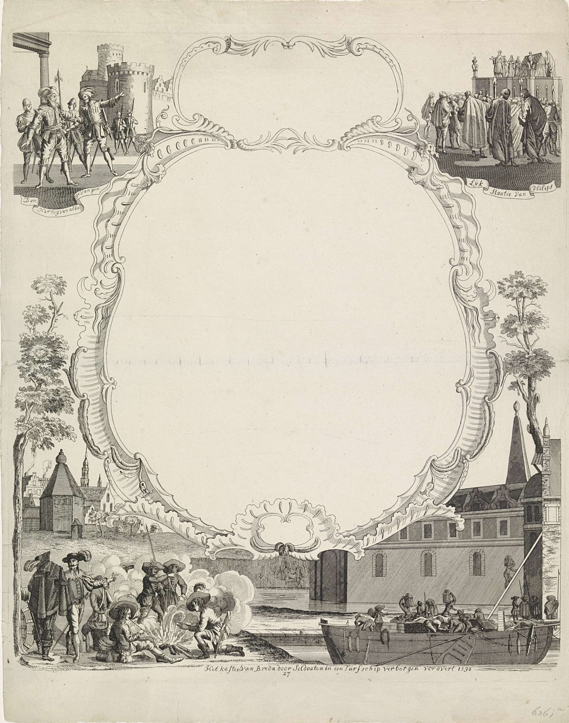 Wensbrief uit ca. 1830 met een onbeschreven cartouche. binnen een kader opgebouwd uit drie historische gebeurtenissen. Boven de gevangenname van de hertog van Alva en lijkstatie van koning Filips II, onderaan het turfschip van Breda.